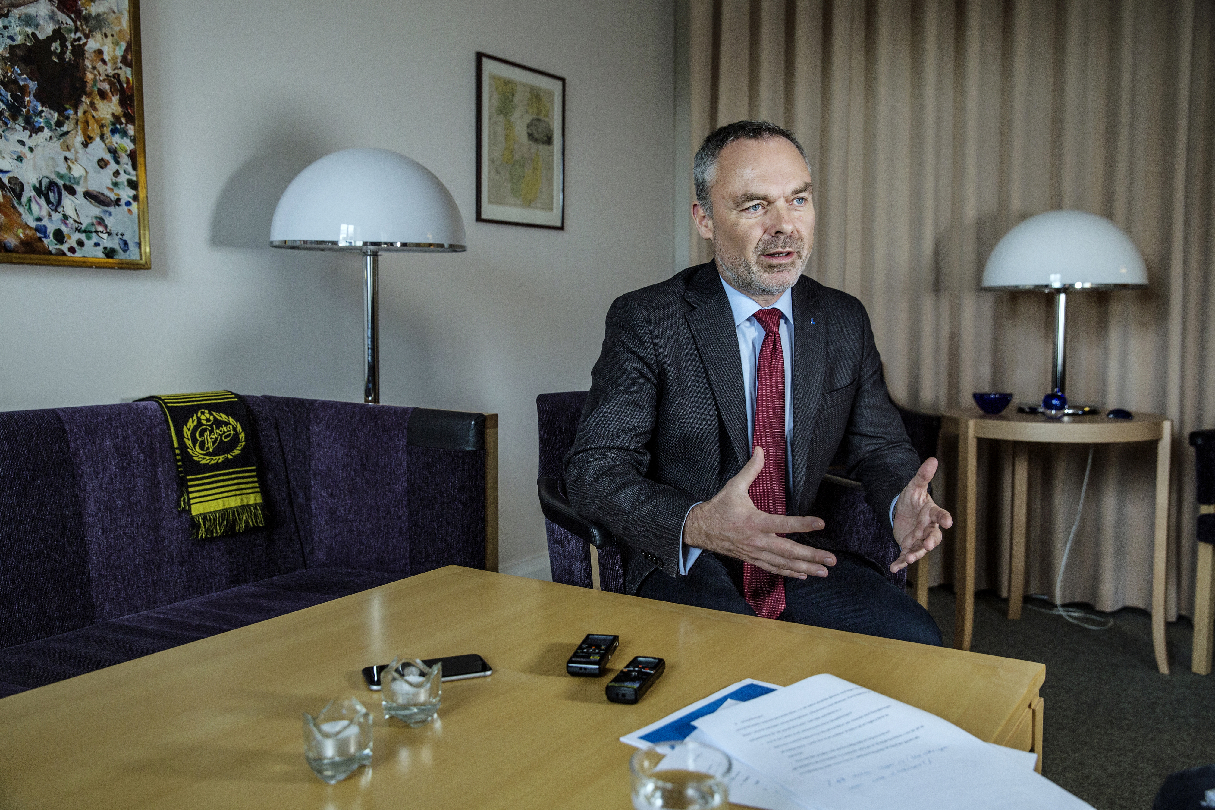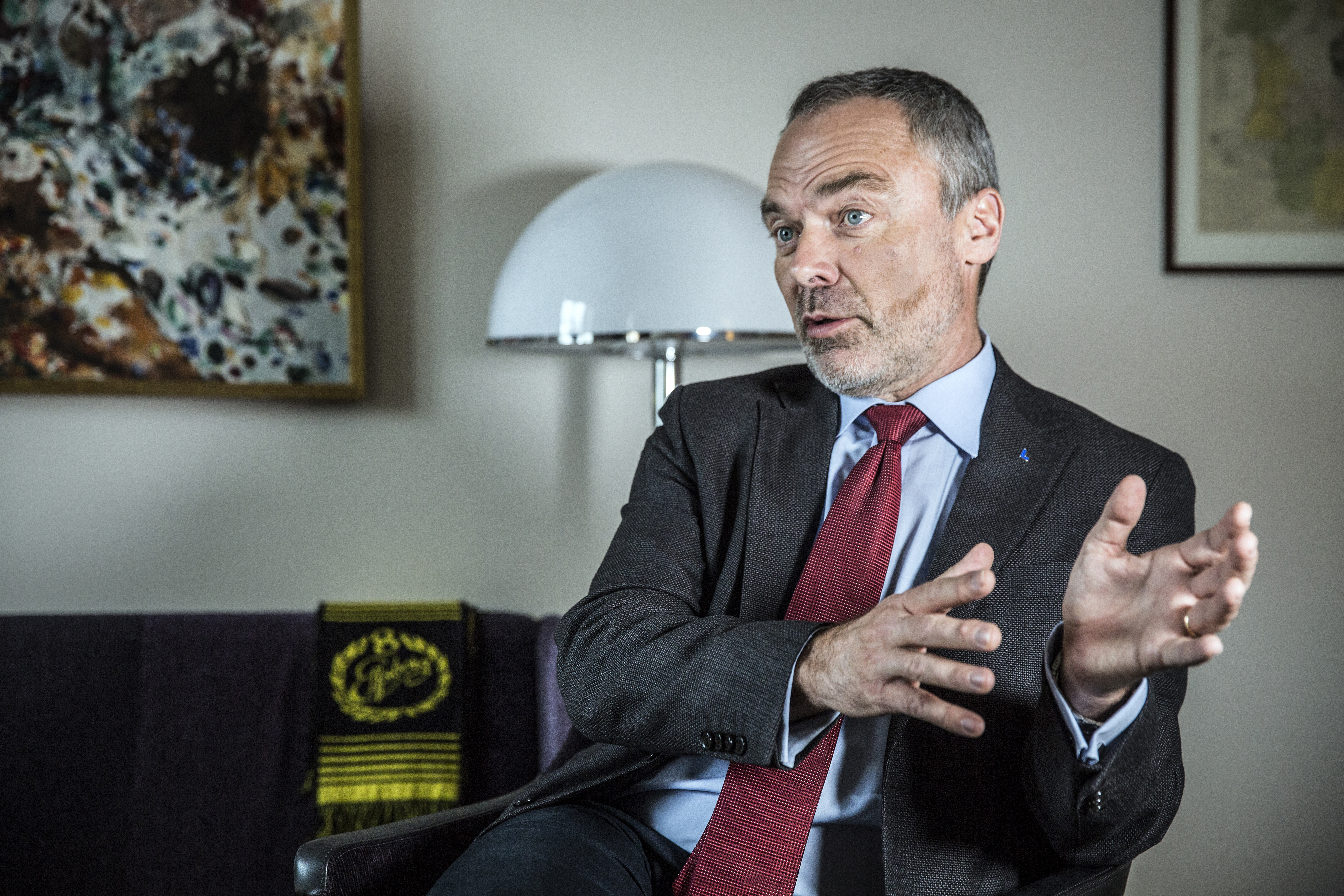 Kulramen i fönstret, familjefotona på skrivbordet och Elfsborg-halsduken i soffan – personliga markörer i Jan Björklunds arbetsrum i riksdagen.