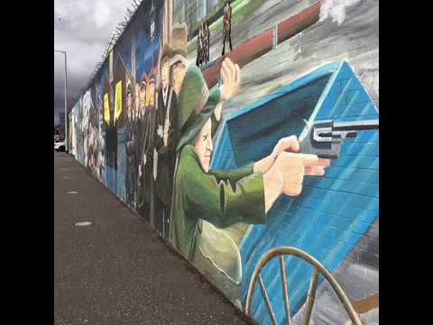 I staden finns en ”fredsmur” med taggtråd och ståldörrar som separerar de två sidorna från varandra. Och runt om i staden finns muralmålningarna. Bilder på automatvapen, kvinnor och män som kämpar och fallna hjältar och hyllningar till paramilitära organisationer på båda sidor.