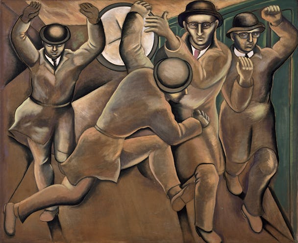 Målningen Happy Boys från tidigt sjuttiotal med de framrusande männen skulle kanske lika gärna vara en tidsbild från i dag som en målning som förutspådde det kommande 80-talet.