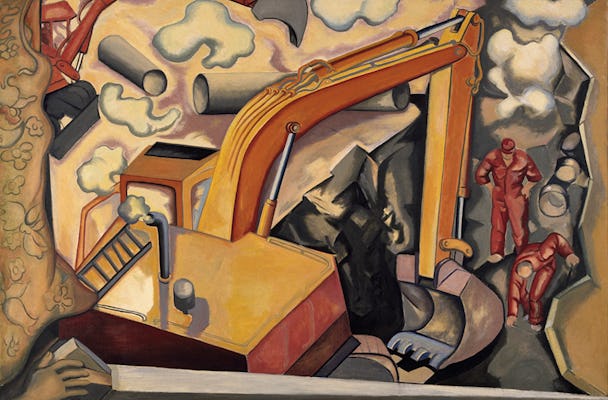 Men se även på ingenjörerna som sitter på rad vid sina ritbord vid Sergels Torg i målningen Akvarium.