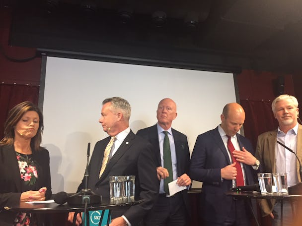 Från vänster vid talarborden: Eva Nordmark, ordförande TCO, Göran Arrius, ordförande Saco, Peter Jeppsson, vice vd Svenskt Näringsliv, Mattias Dahl, vd Transportföretagen och Torbjörn Johansson, avtalssekreterare LO.