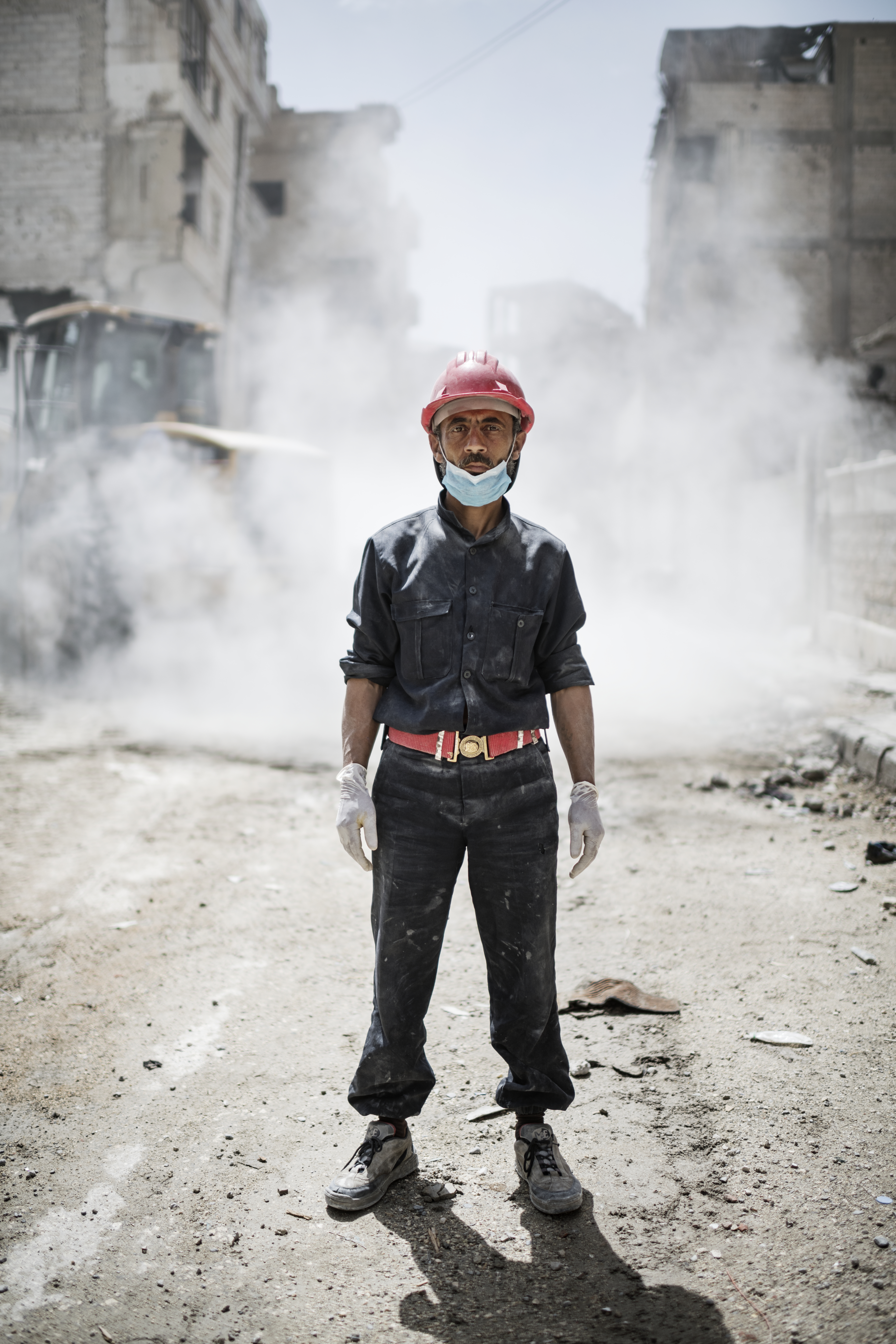 – Daesh (förkortningen för Islamiska staten på arabiska). Han har upptäckt ett självmordsbälte. Försiktigt fäster han ett rep runt bältet. Sedan ställer han sig bakom en vägg och drar väldigt varsamt i repet. Alla tystnar och blir blickstilla. Bältet detonerar inte. Alla drar en lättnadens suck. Kvarlevorna bokstavligt talat sopas upp och läggs i en liksäck. Ett annat lik som hittas på en annan plats i byggnaden läggs också i säcken.