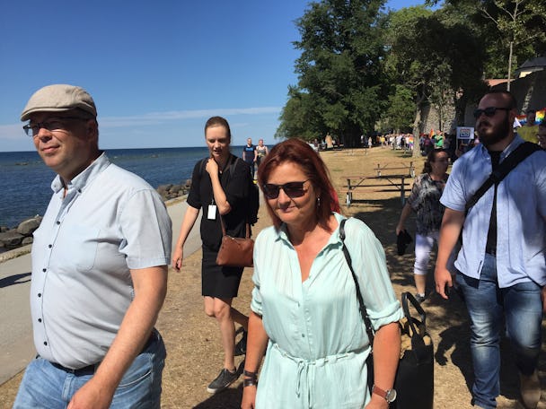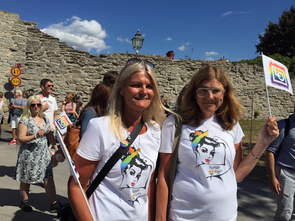 Flera LO-toppar deltog under årets Mångfaldsparad i Visby. IF Metalls ordförande Marie Nilsson, Livs ordförande Eva Guovelin och LO:s förste vice ordförande Therese Guovelin.