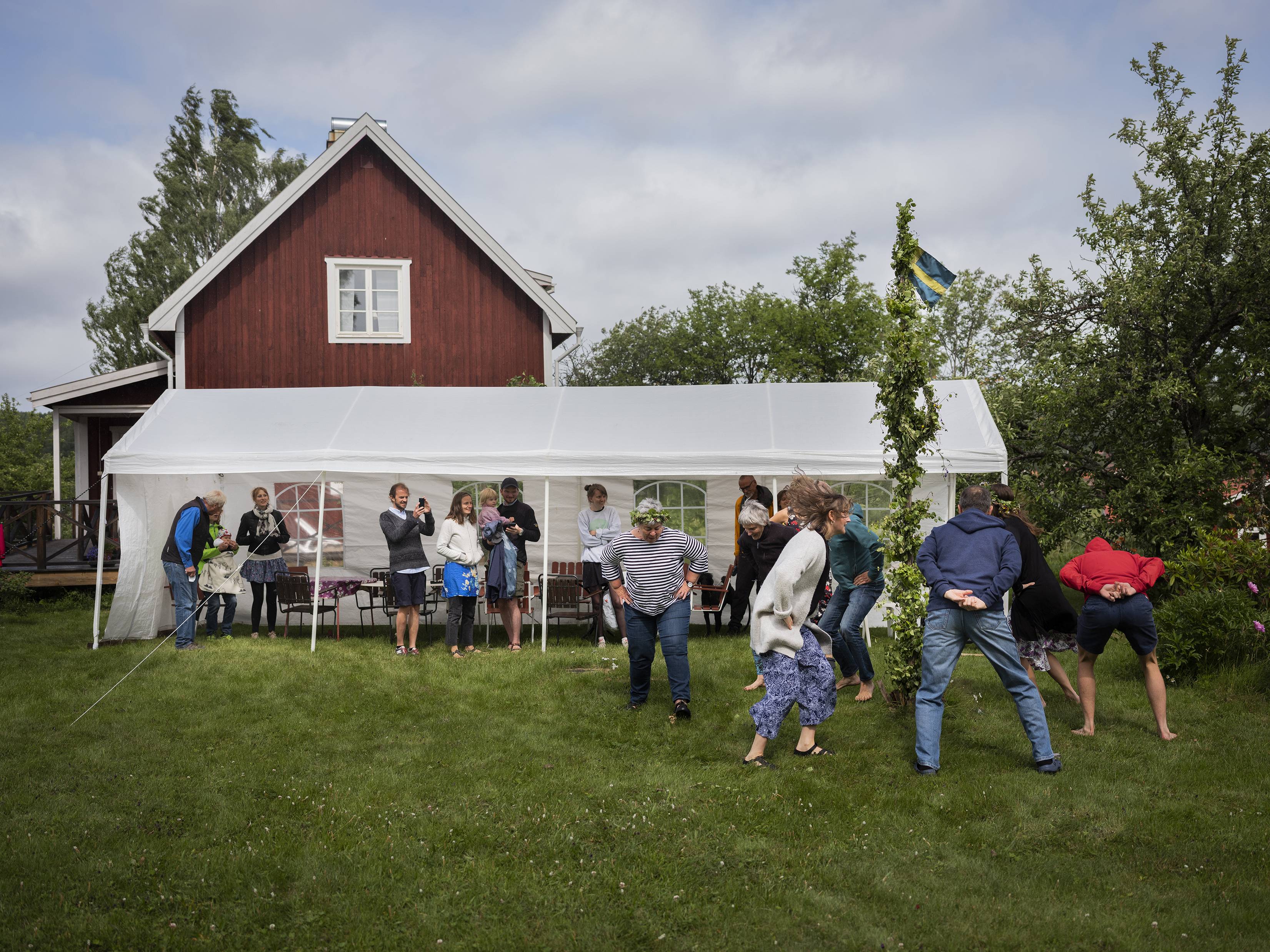 På midsommardagen reser vi majstången. Steg för steg närmar vi oss en 90 graders vinkel och väl färdigdansade samlas alla i bystugan för att se Sveriges match mot Tyskland.