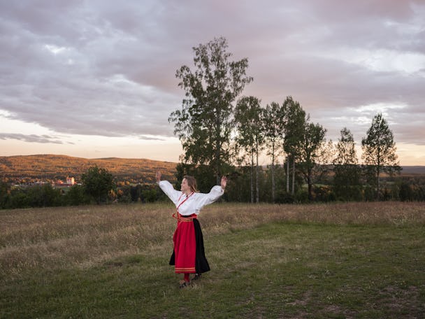 Kjolen på farmors folkdräkt flyger i luften.