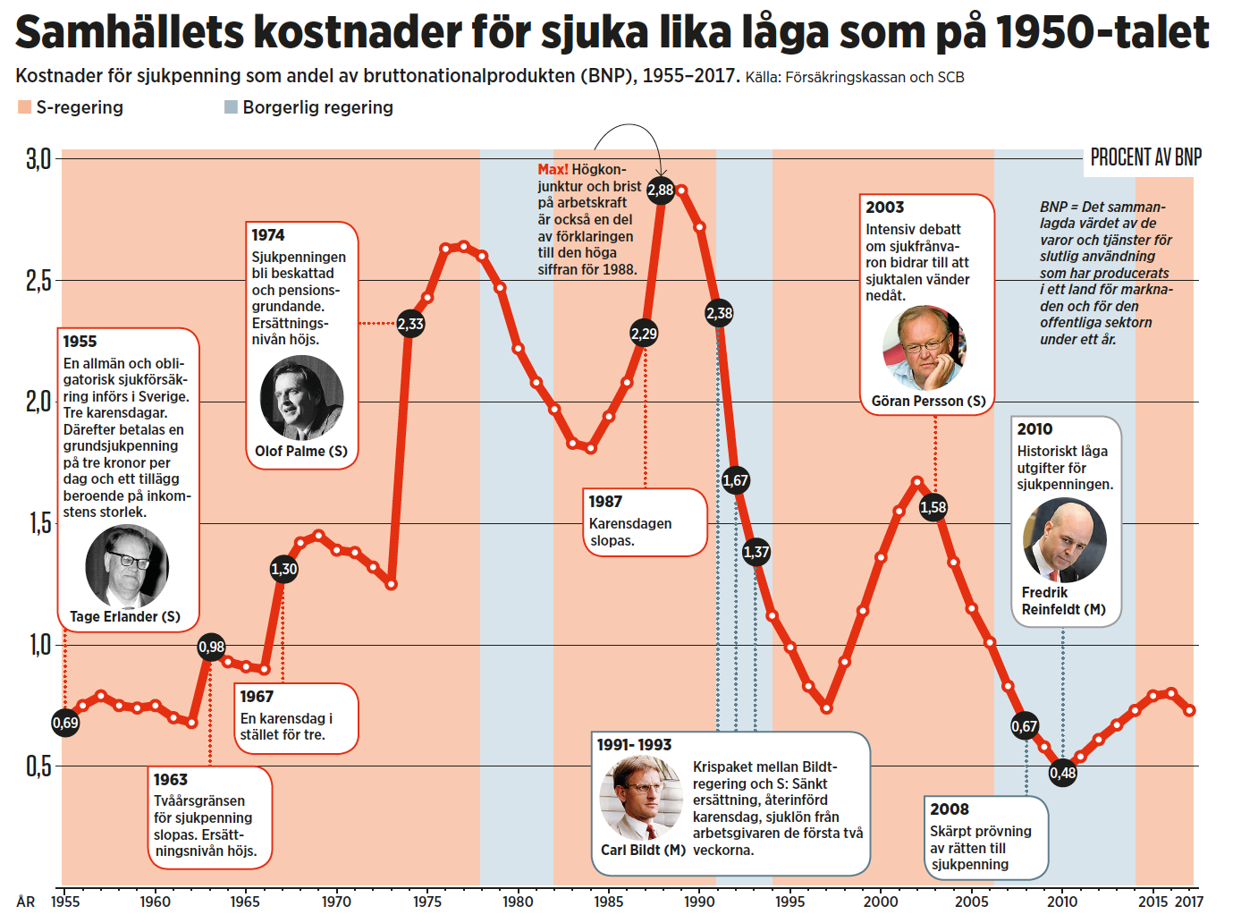 • 2010 var de offentliga utgifterna för sjukpenning och rehabiliteringspenning 0,48 procent av BNP. 1988, då utgifterna var som högst, var de exakt sex gånger högre: 2,88 procent av BNP.