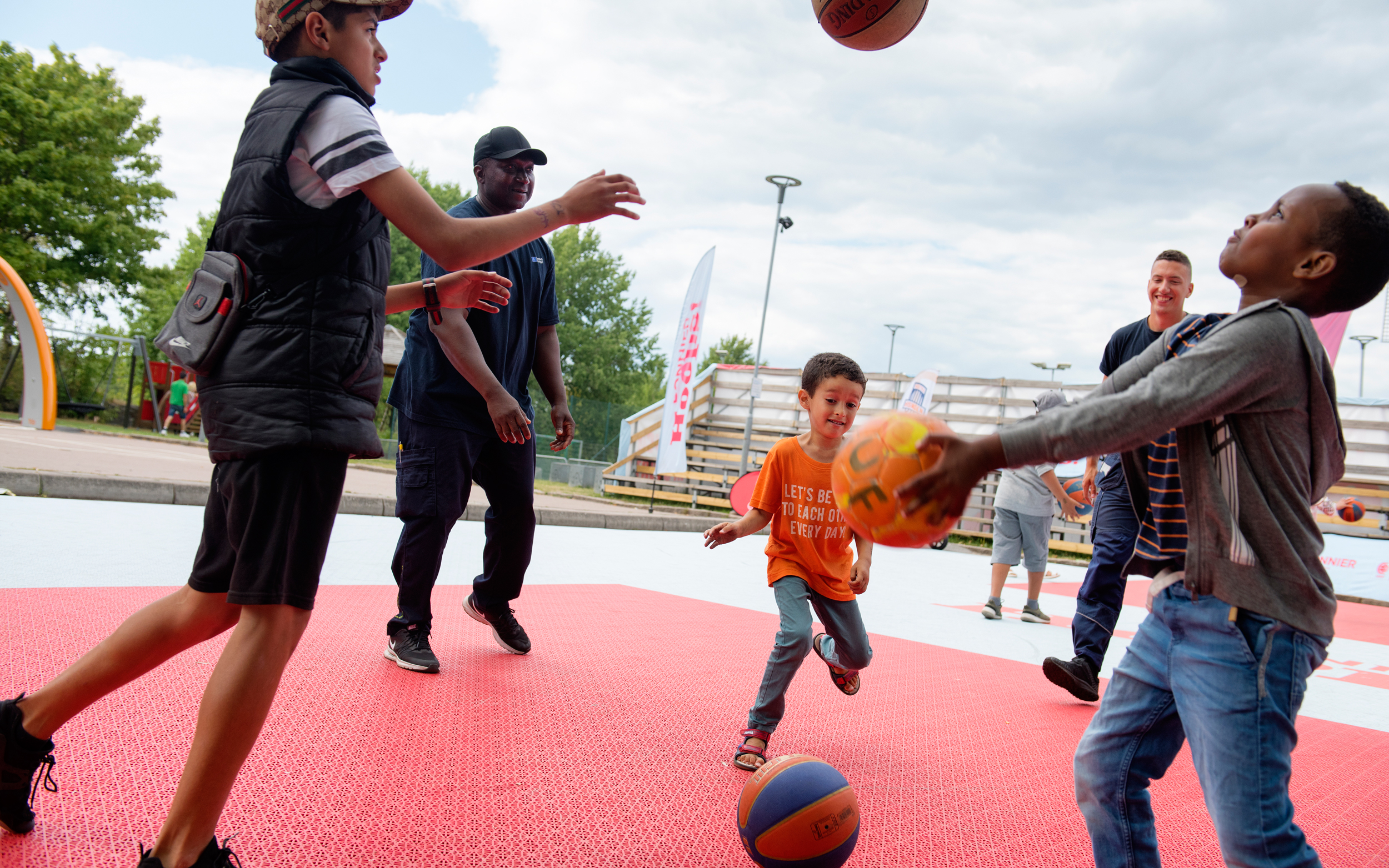 Uppe vid generationslekplatsen Mosskanten ordnar bokförlaget Bonnier tillsammans med lokala aktörer varje dag den här sommaren något som kallas Bonnier Hoops. Den lokala projektledaren Anders Hjorth berättar att det är första året i Göteborg men att det funnits flera år i Kista.