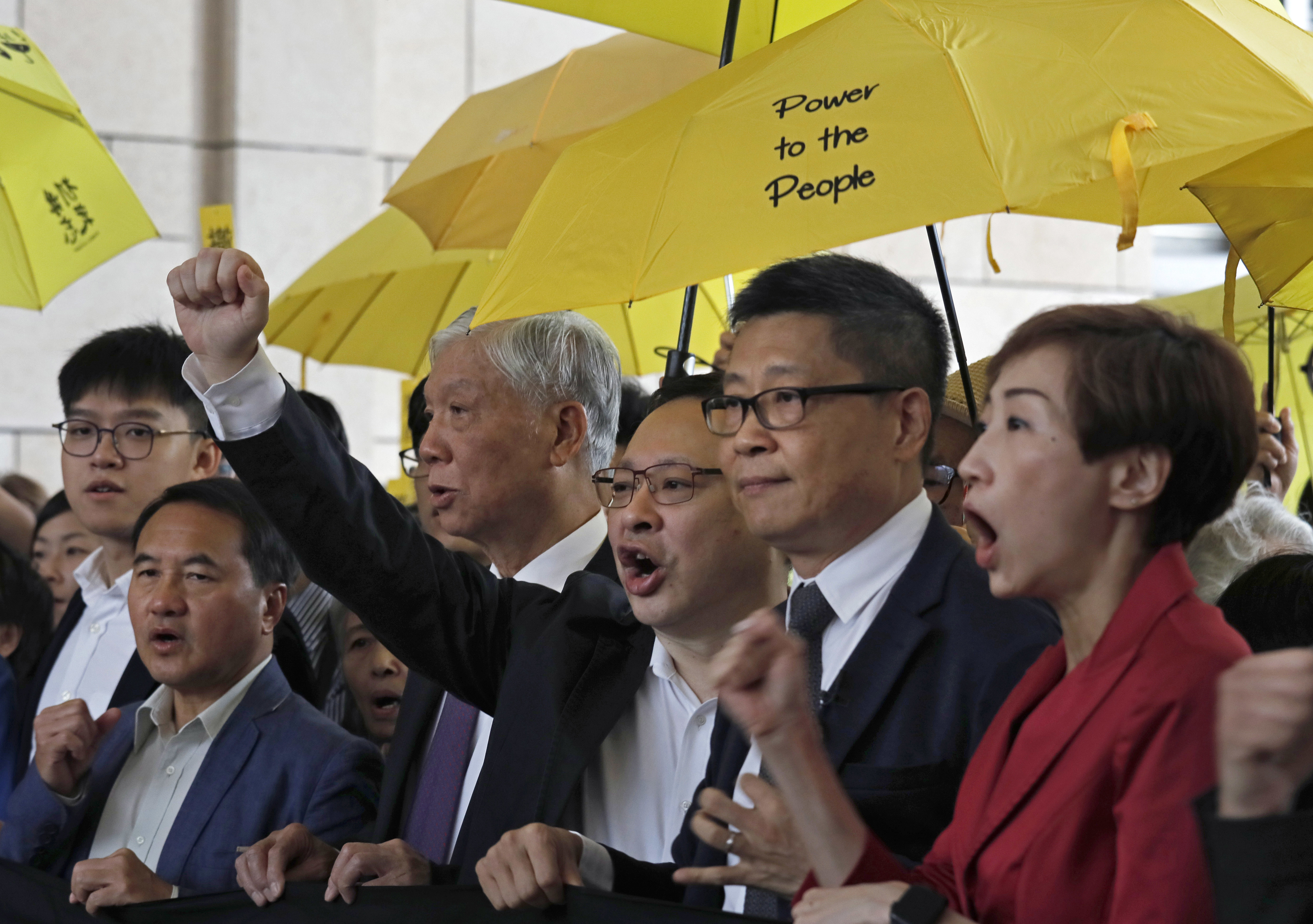 Occupy Central-aktivisterna Tanya Chan, längst till höger, Chan Kin Man, Benny Tai, Chu Yiu Ming and Lee Wing skriker slagord tillsammans med sympatisörer innan de går in i rätten.