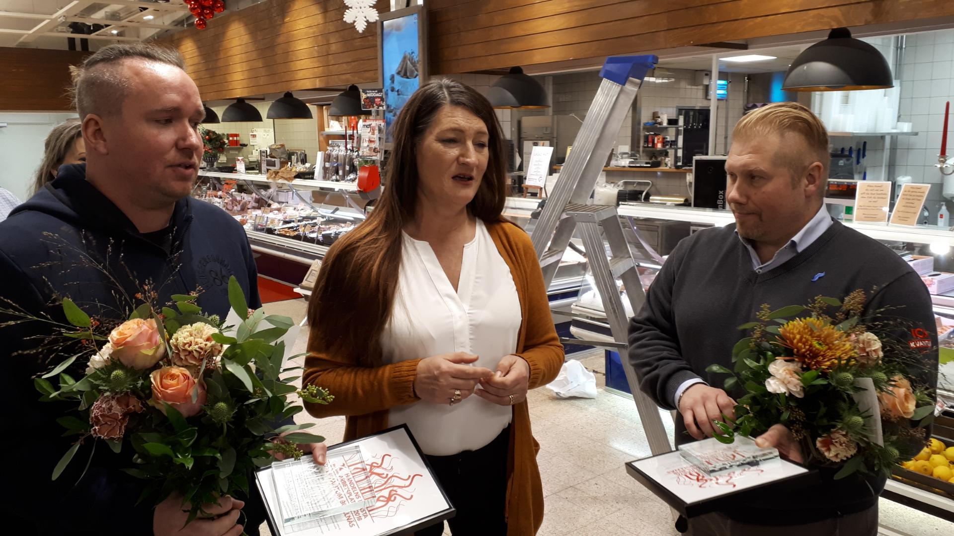 Susanna Gideonsson delar ut priset till Handelns bästa arbetsplats – Ica Kvantum Bollnäs. Till vänster klubbordförande Klas Modd, till höger handlare Magnus Olsson.