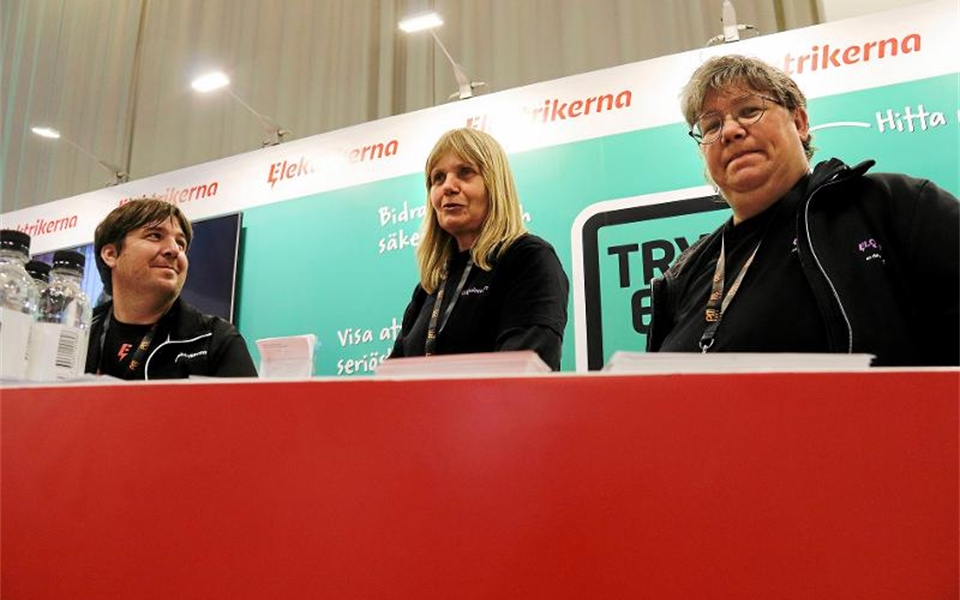 Jens Hansson, Christine Svedjestrand och Ninni Blom i Elektrikernas monter. Foto: Anna Norling