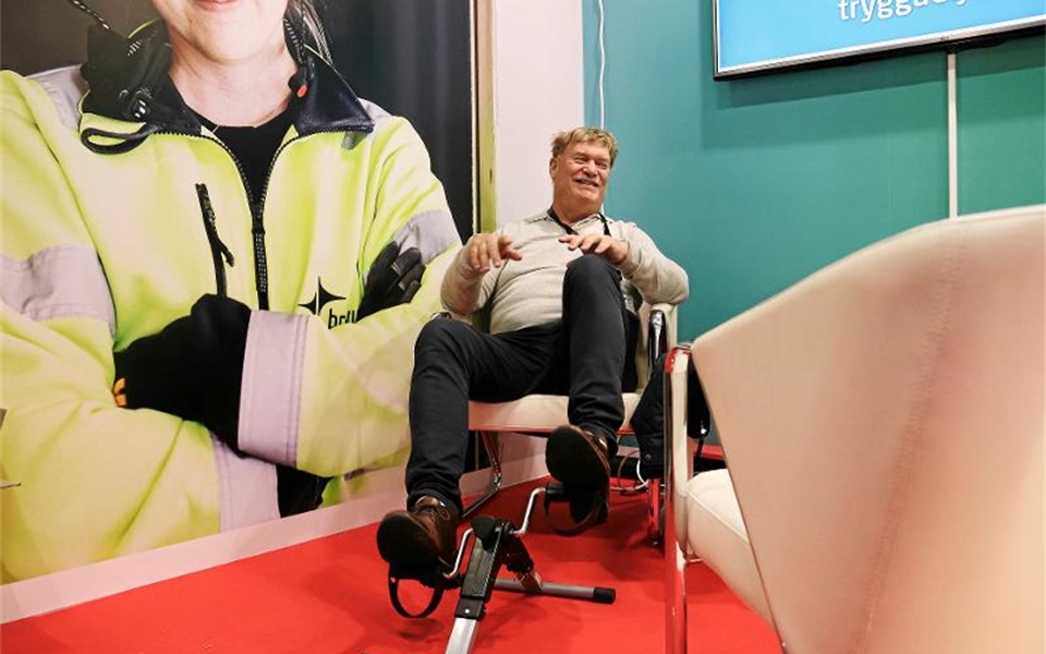 Håkan Wiström har varit medlem i Elektrikerförbundet i 50 år. Under Elmässan i Kista deltar han i försäkringsbolaget Helps cykeltävling i SEF:s monter. Håkan har hunnit fylla 65 år och har arbetat länge på Svenssons elbyrå. – Jag började någon gång på 1970-talet där. Foto: Anna Norling