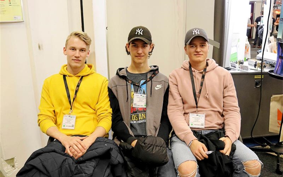 Ossian Karlsson, German Laskin, Gustav Löfling, läser tredje året vid Bromangymnasiet i Hudiksvall:– Skruvmejsel som skruvar av sig själv, säger Gustav Löfling. Foto: Anna Norling