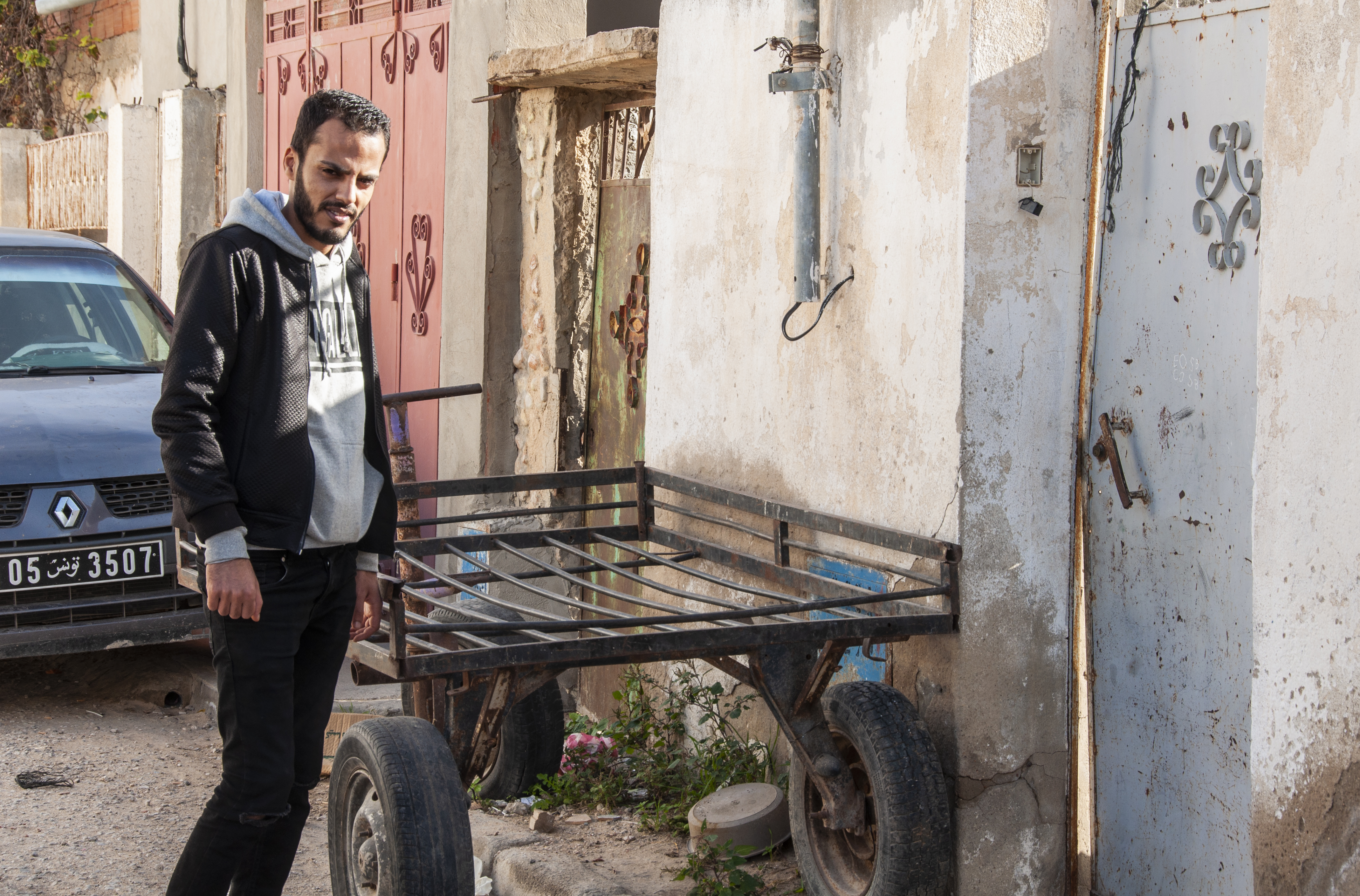 This is Issaouis Bilels’ home turf. He is 28 years old and lives with his parents and six siblings. He shows us around the dusty streets of an area that didn’t exist before the country’s dictator was overthrown eight years ago.