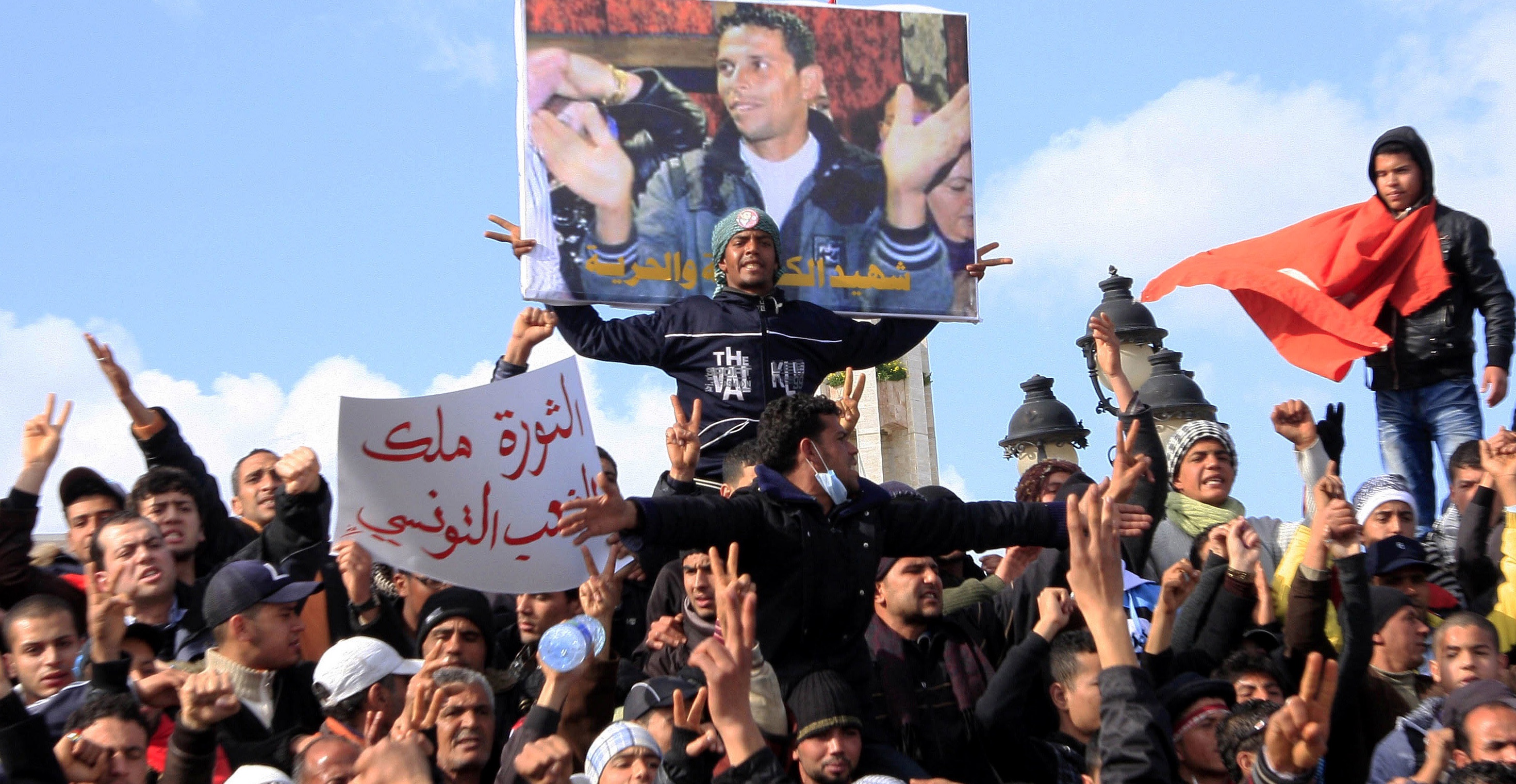Tunisian protesters demonstrate beneath a poster of slain martyr, Mohamed Bouazizi, near the prime minister’s office in Tunis, in 28th of January 2011.