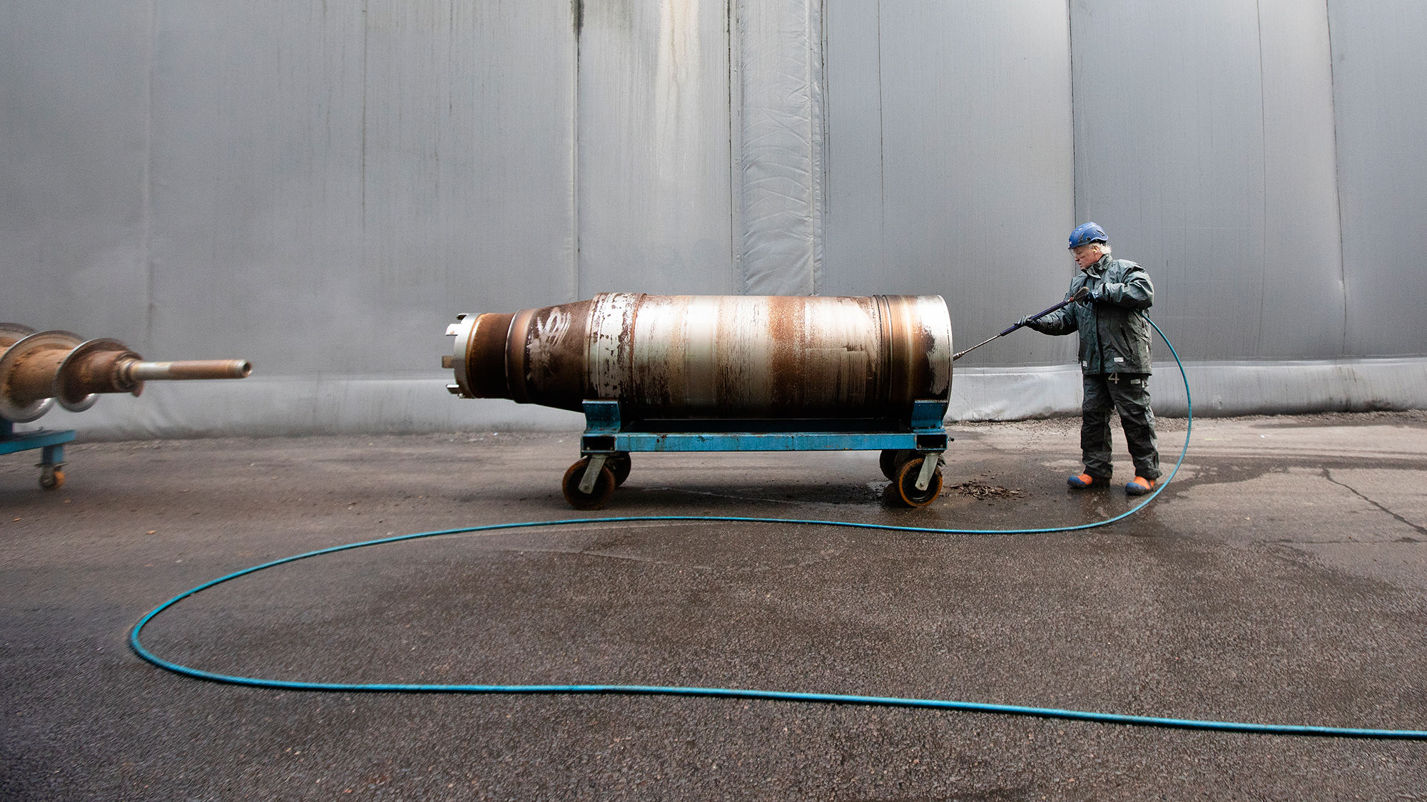 Eddie Thörnwall högtrycksspolar en av foderskruvarna som används på Agroetanol. Vissa skruvar kan ta uppemot en vecka att få rena.