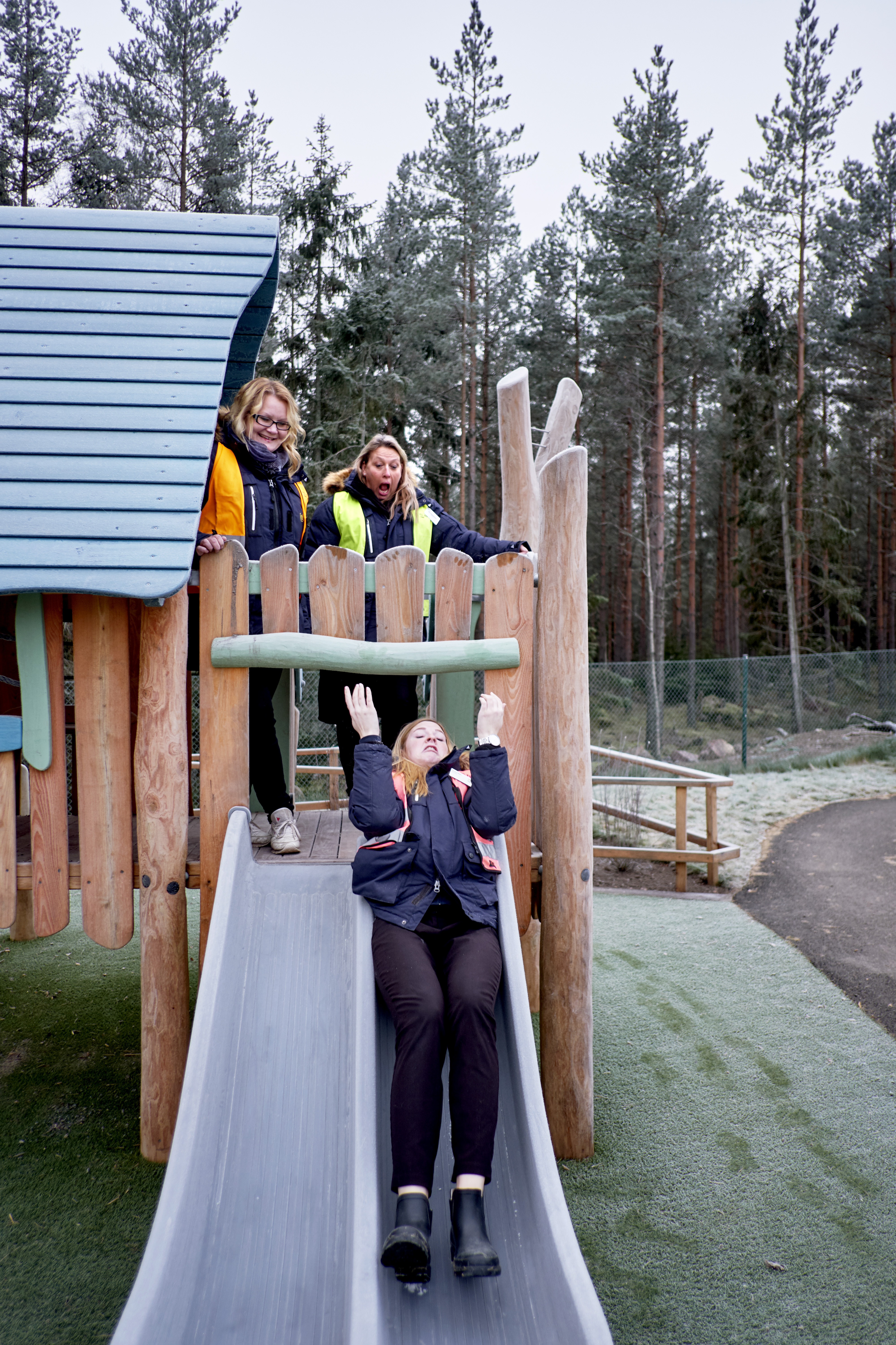 Sandra Helin kastar sig ut, struntar i att det är blött och kallt på rutschkanan