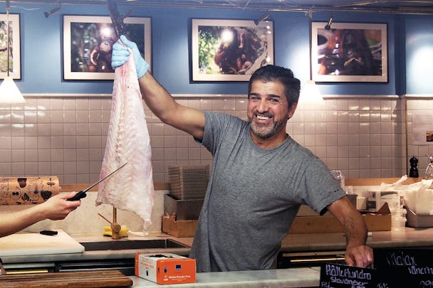 Hussam Ismail har precis hunnit byta om efter dagens arbetspass i fisk- och köttdisken på Stockholms matmarknad.