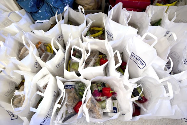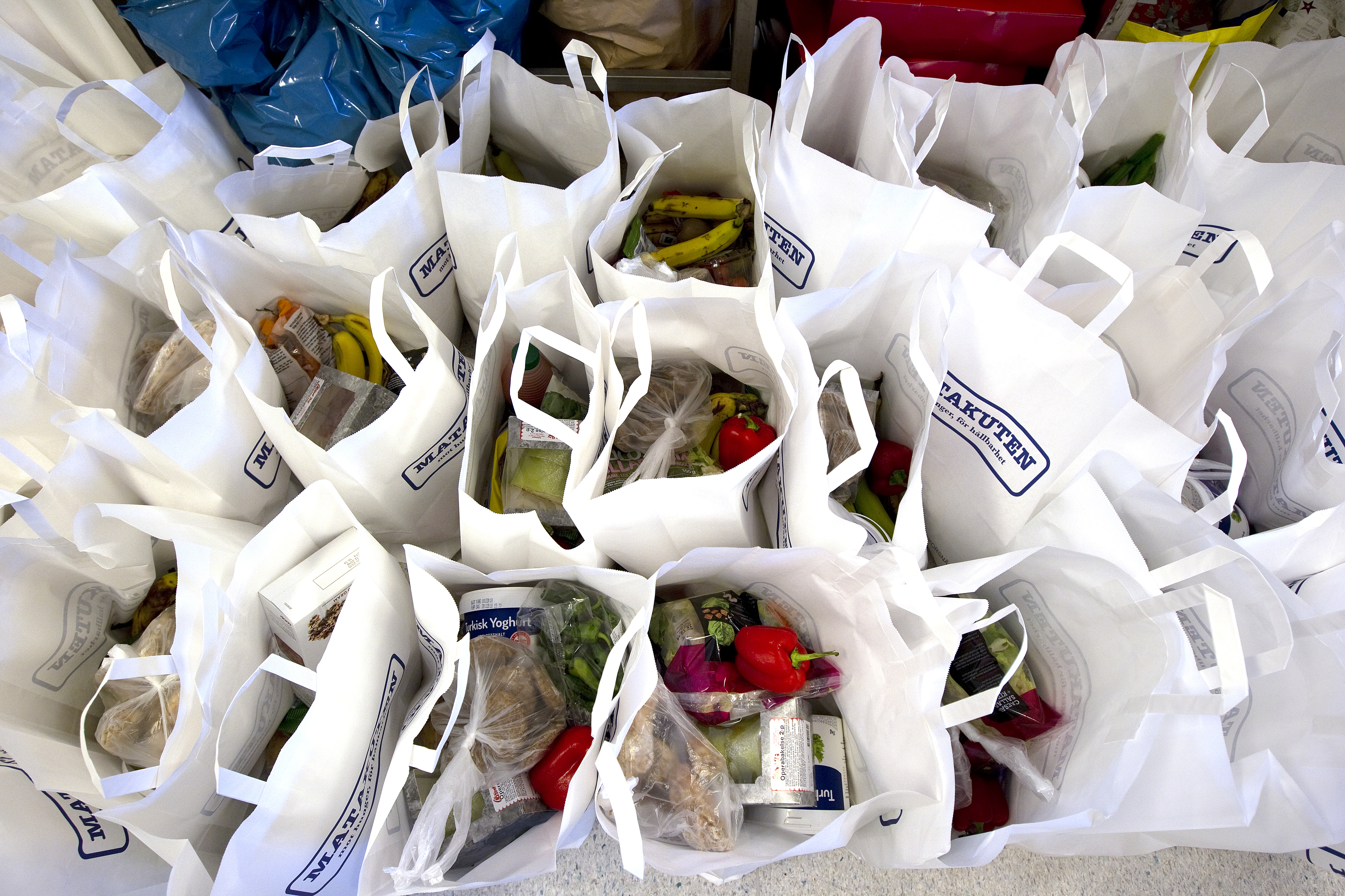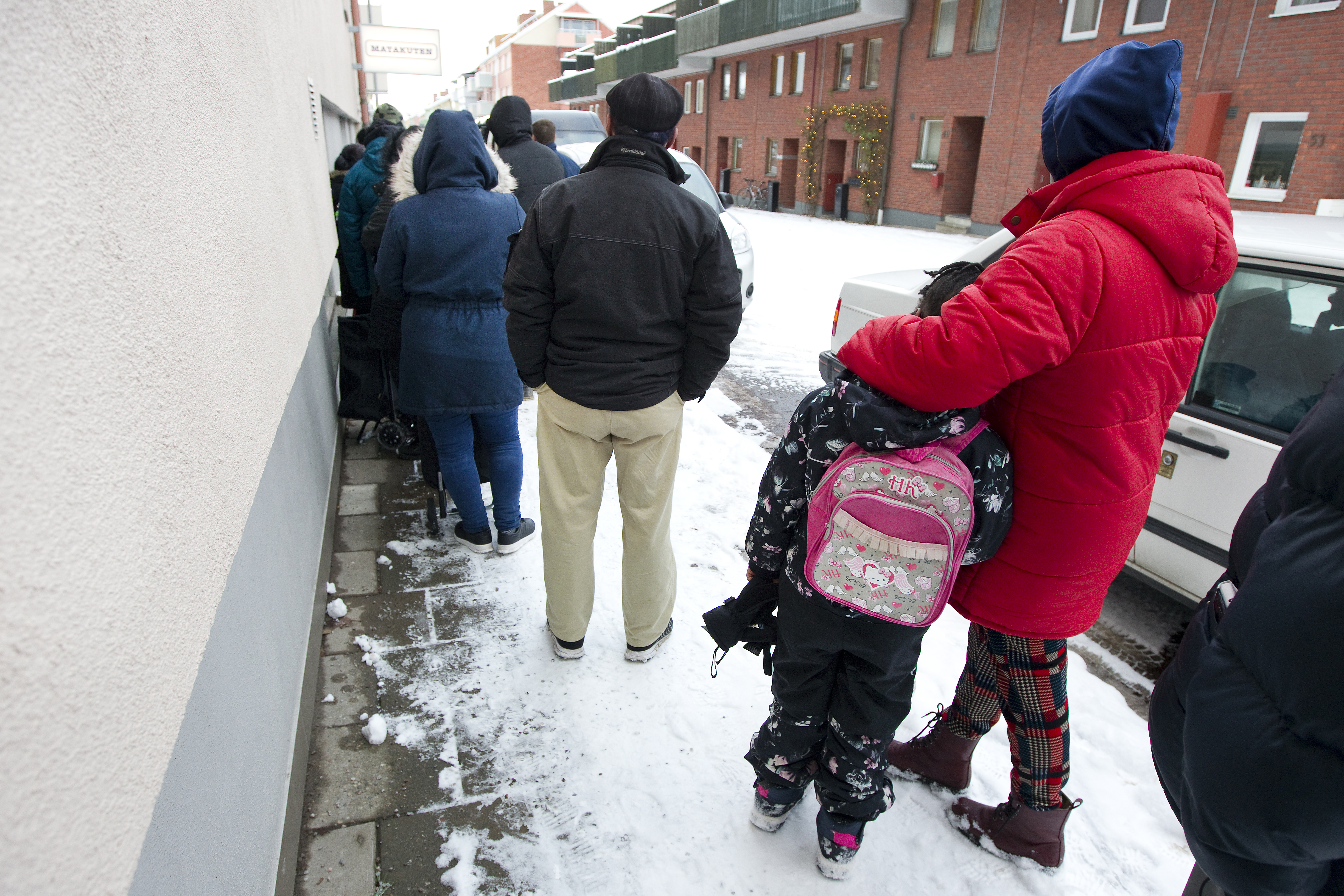 Matkassarna börjar delas ut klockan tolv, men det händer att kassarna inte räcker till alla, så många ser till att få en bra plats i kön.