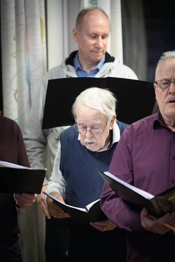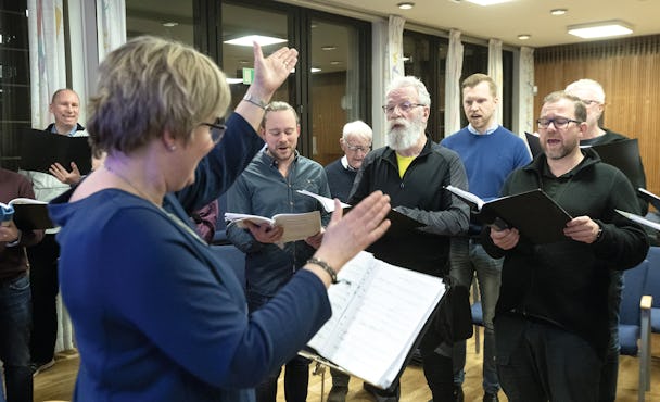 De repeterar för körverket Hjässan är kal, som ingår i ett kulturprojekt med samma namn.