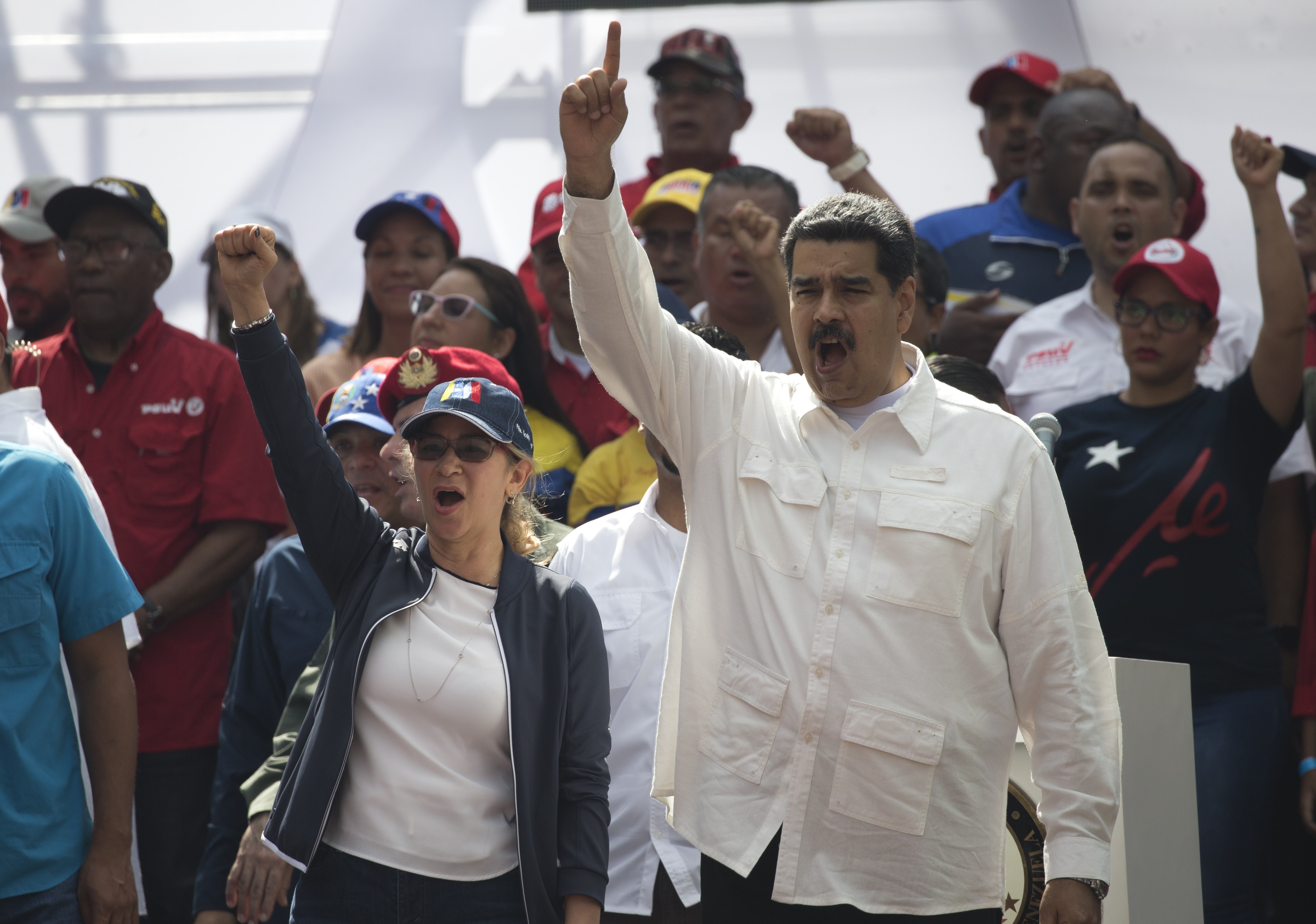 Venezuelas President Nicolas Maduro and first lady Cilia Flores chant, ”Yankees go home” during a pro-government rally in Caracas, Venezuela, Saturday, March 9, 2019.