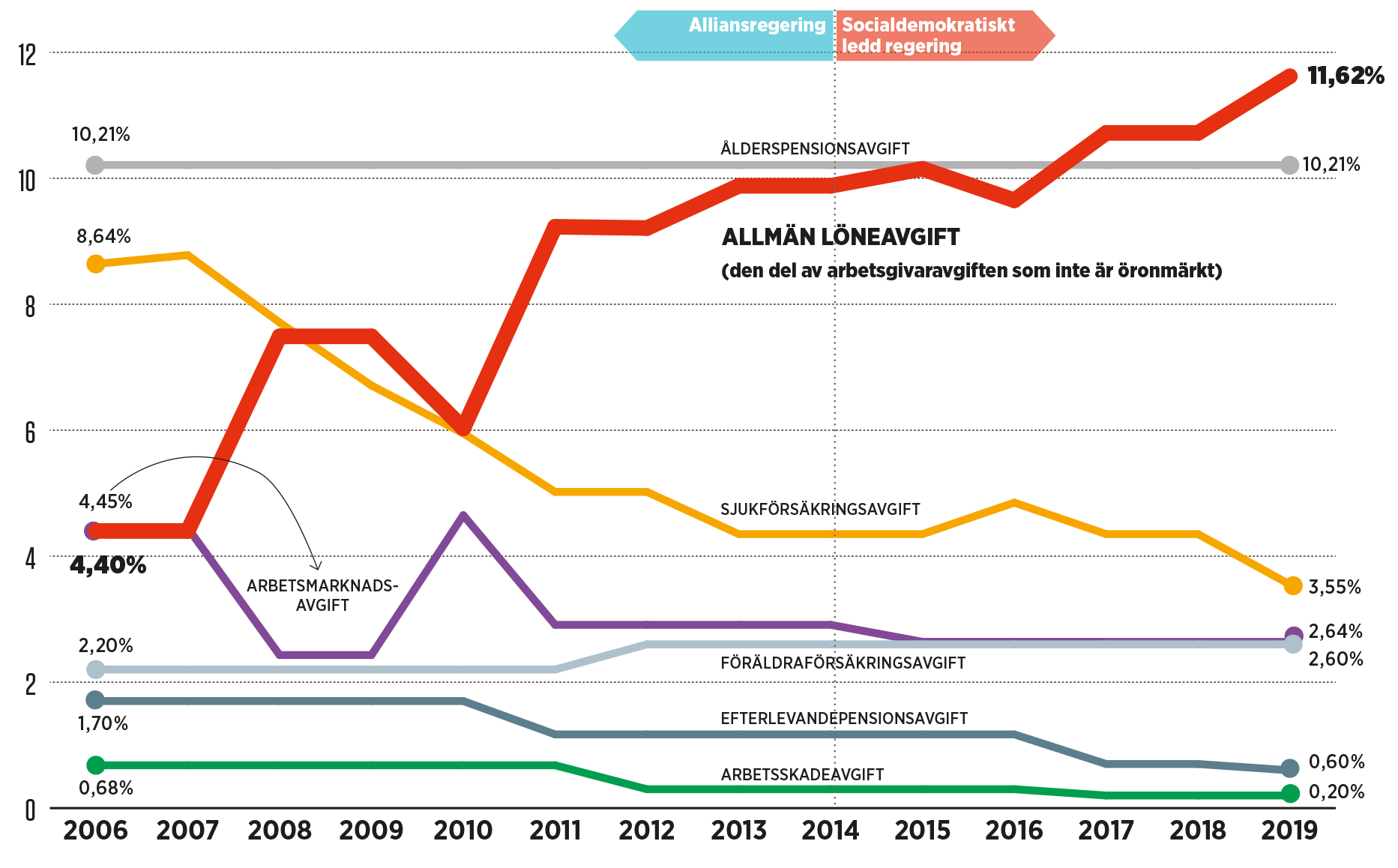 Arbetsgivaravgiftens beståndsdelar, i procent av lön. Utveckling 2006–2019.