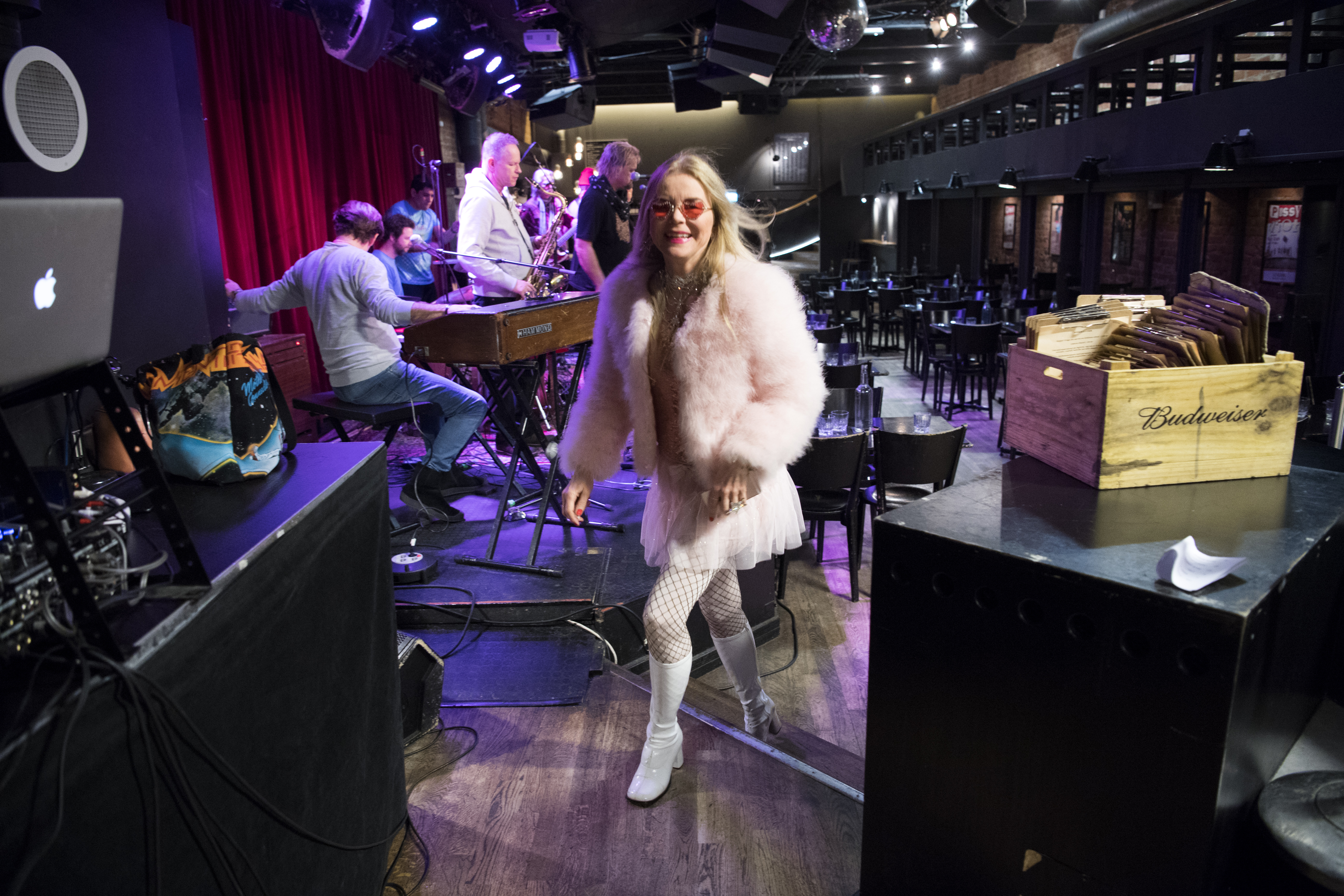Vid sidan av scenen har Monica Bergmark riggat mixern, datorn och övrig utrustning, pluggat in hårddisken och öppnat mappen med de 2 000 utvalda låtarna, ställt fram två flaskor vatten. Kvällens artist, Emrik, har soundcheckat.