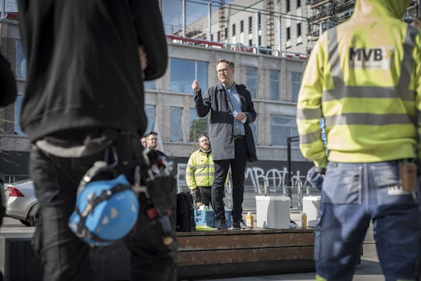 Ungefär så brukar det se ut, berättar han efter att han stigit ner från podiet och byggnadsarbetarna gått tillbaka till arbetet.
