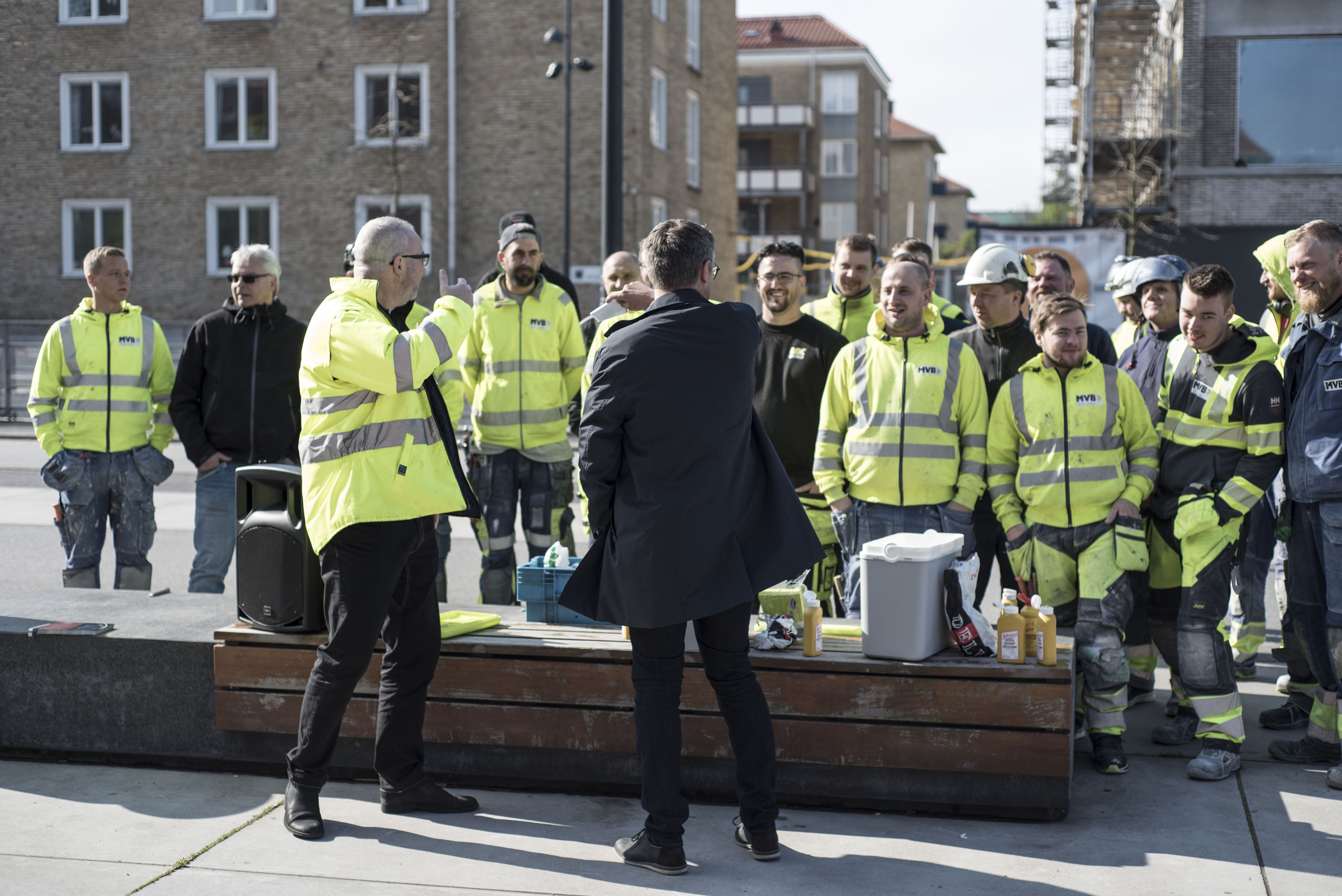 På torget utanför Malmö konsthall står omkring 30 byggnadsarbetare.