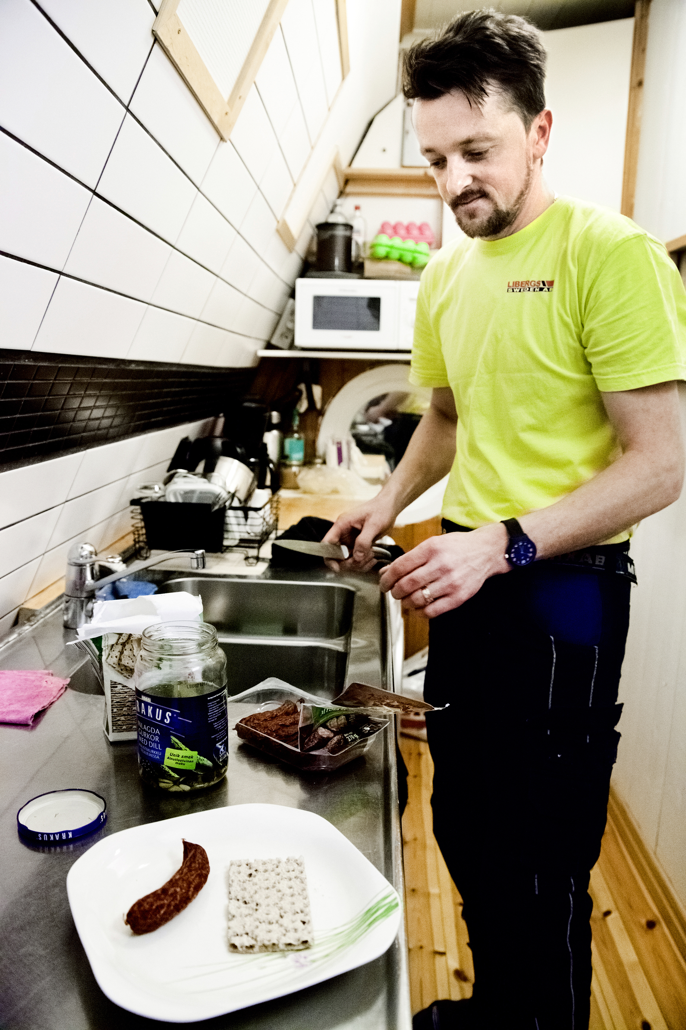 Här möts Sverige och Polen via några snusdosor, en trave med fackförbundstidningen Byggnadsarbetaren och saltgurkan i kylen. På Andrzejs rum finns foton på familjen och en kudde med frun Agnieszkas bild.