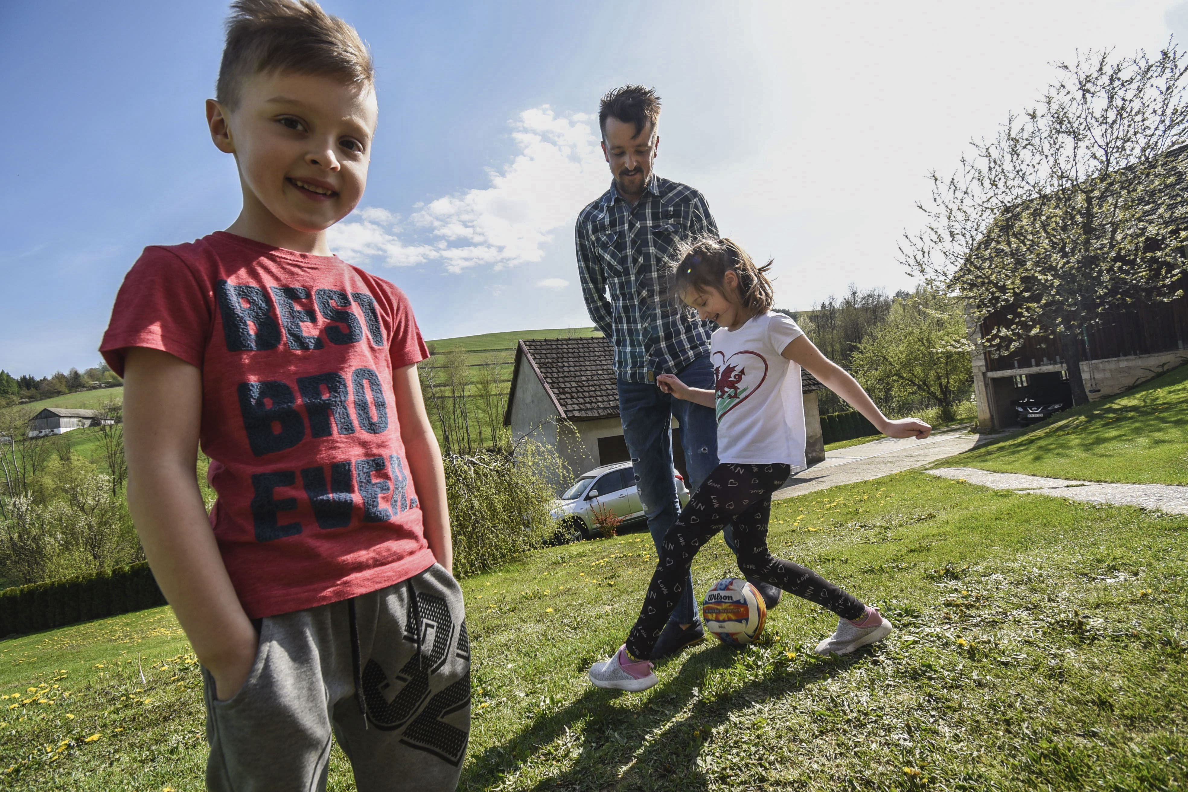 Hon och hennes lillebror Marcel sparkar en fotboll över den gräsmatta som Andrzej brukar börja med att klippa när han kommer hem.