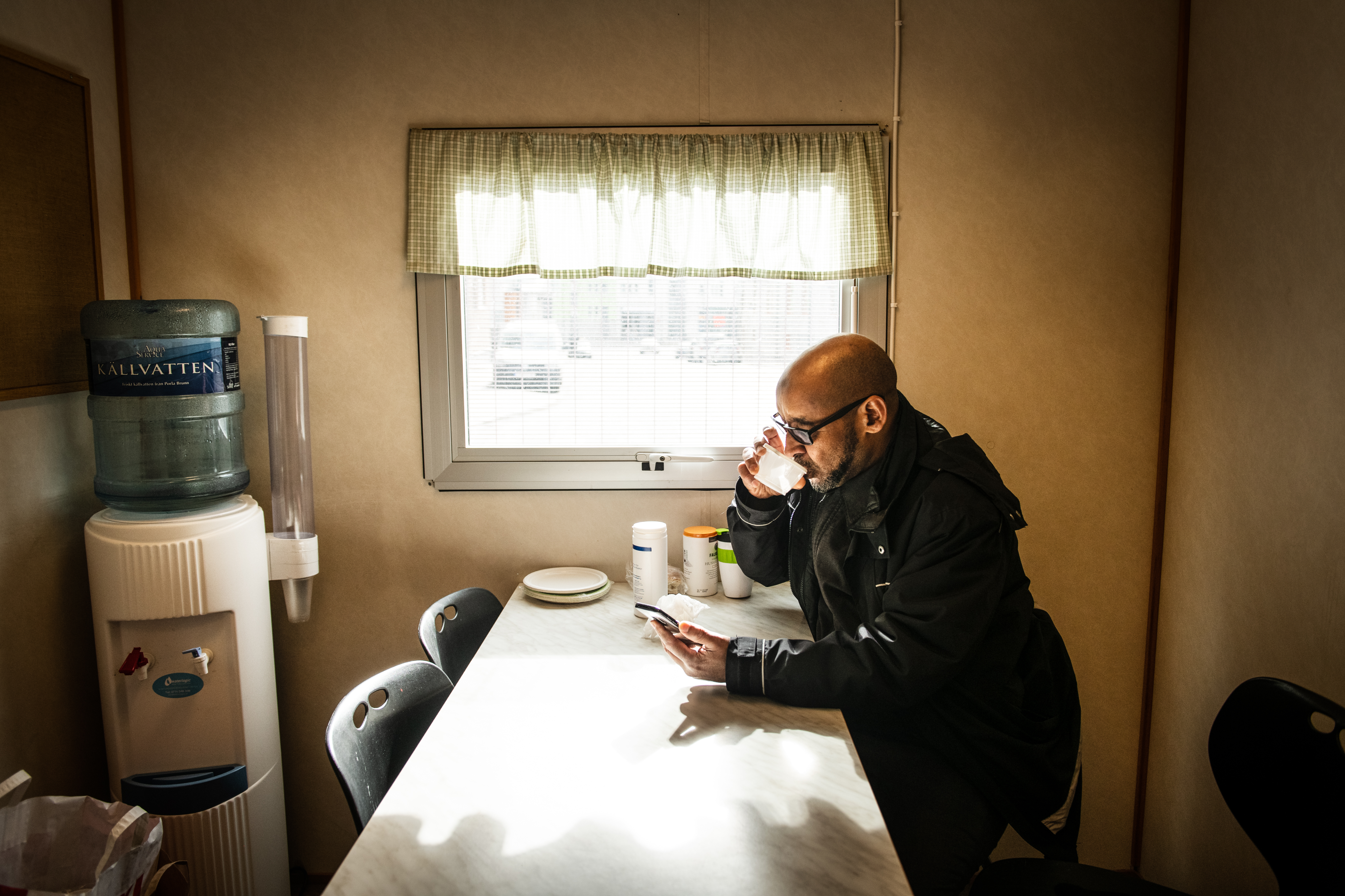 Han visar den lilla fikaboden bredvid garaget. Där äter han och dricker vatten, men alltid ensam.