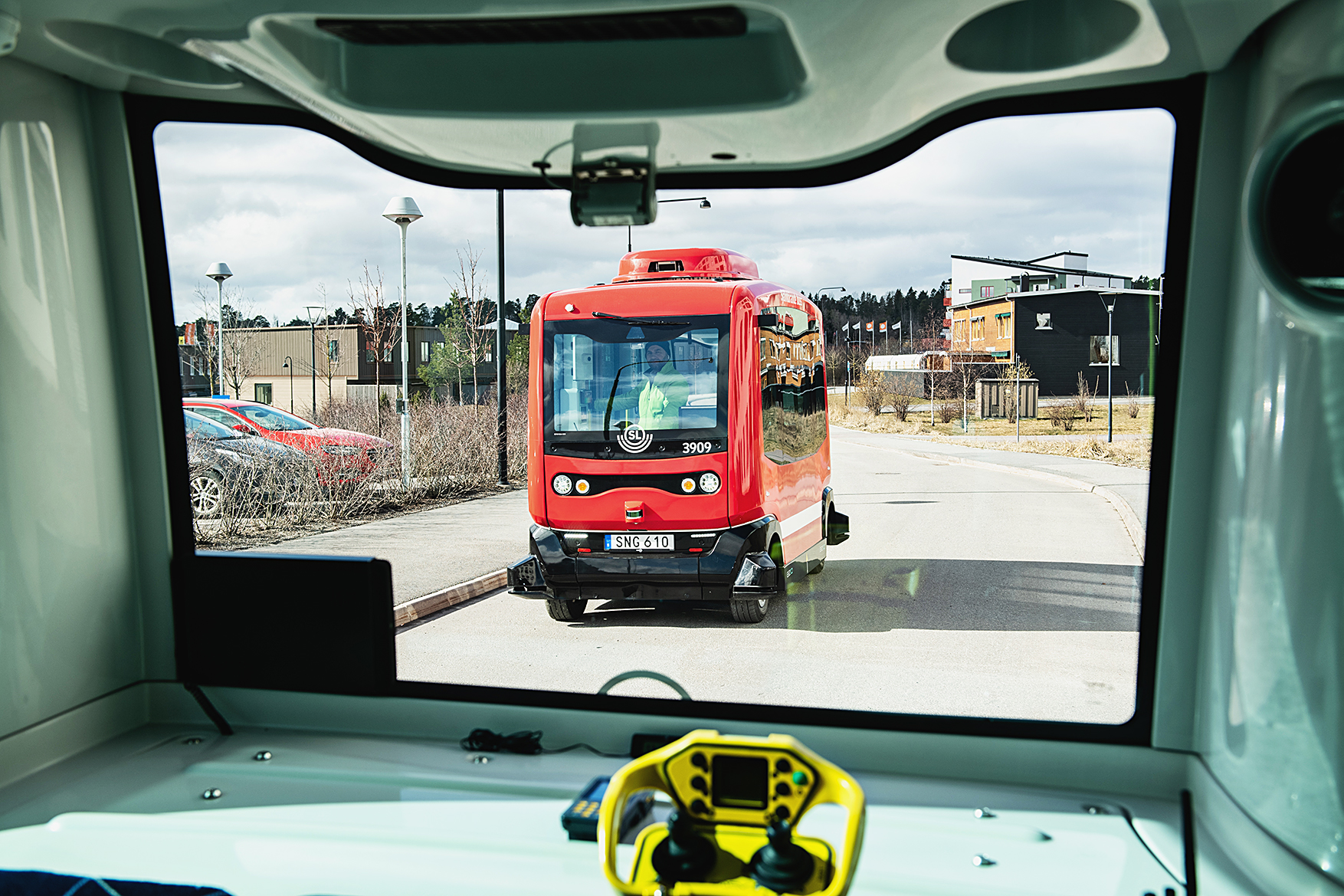 Det är en småkylig vårvinterdag och kylan sveper över Stora torget i nybyggda Barkarbystaden norr om Stockholm. Det blåser cirka fyra meter per sekund, ingen storm alltså, men det får ändå den lilla röda bussen som kommer körande mot torget att stanna till några meter innan den ska svänga in på hållplatsen. Det tar några extra sekunder för bussen att ta sig fram till målet.
