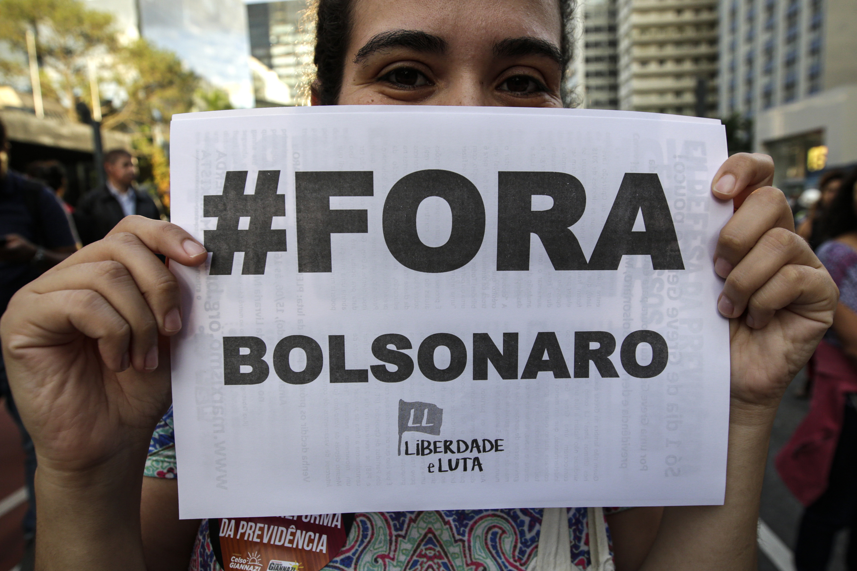 "Ut med Bolsonaro" står det på lappen som en demonstrant höll upp under den nationella strejken den 14 juni.