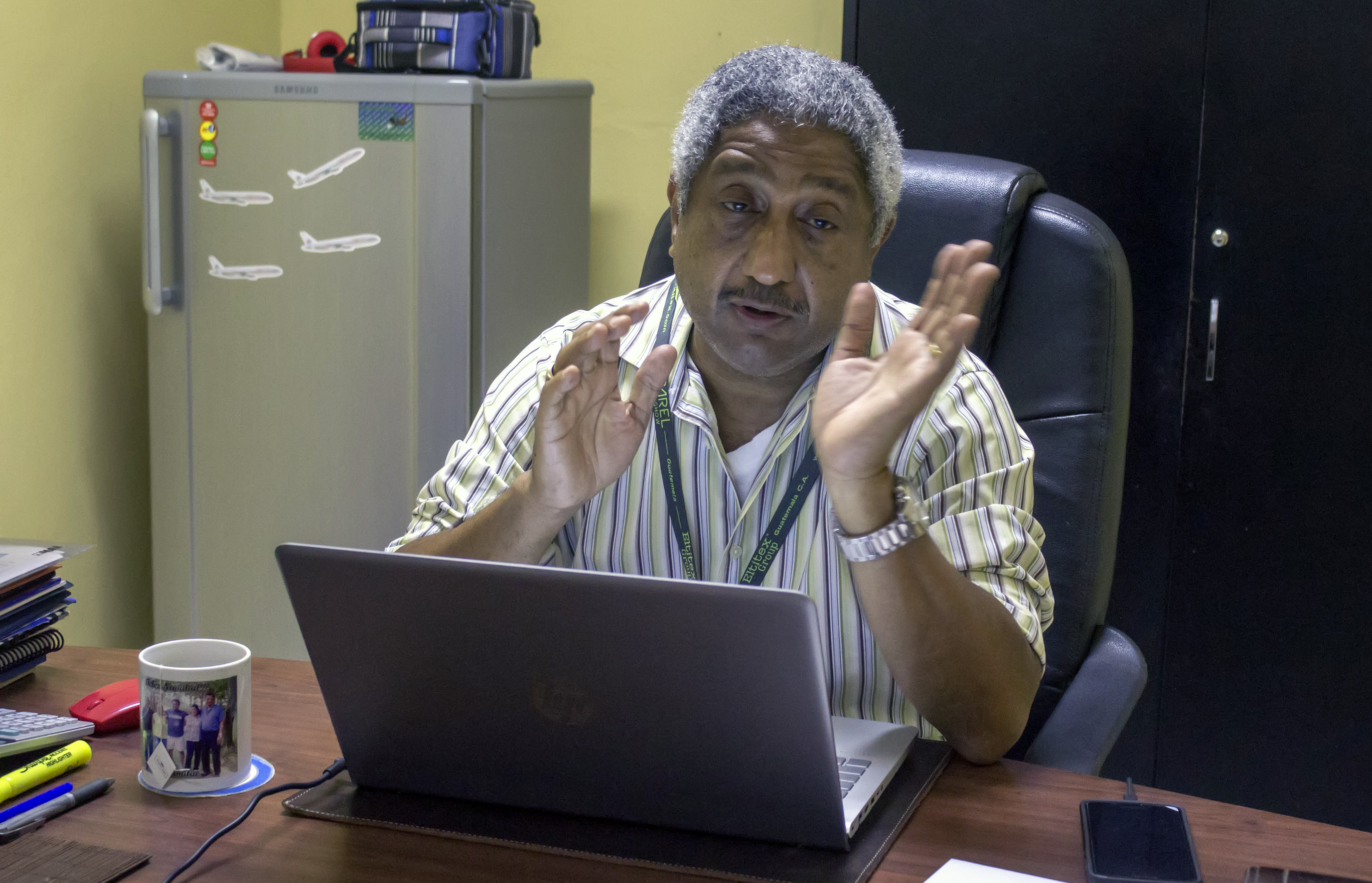 Han tar emot på ett litet kontor, i vad som närmast kan liknas vid en container, bakom en av många maquiladoras som ligger i en förort nära den internationella flygplatsen i huvudstaden Managua.