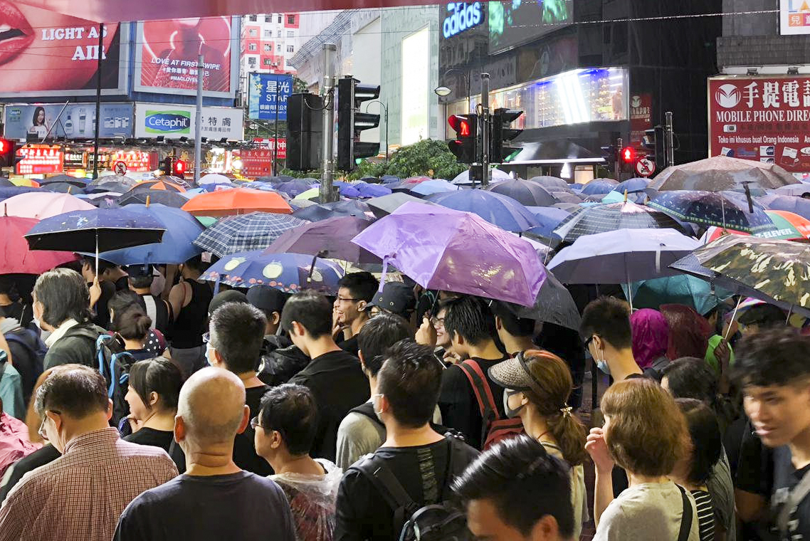 – Att vi går här visar att vi Hongkongbor är envisa. Vi fortsätter att protestera, sa Daniel Li, en av deltagarna i söndagens marsch till Arbetet Global, när han kryssade mellan människorna i ösregnet utanför Victoriaparken.