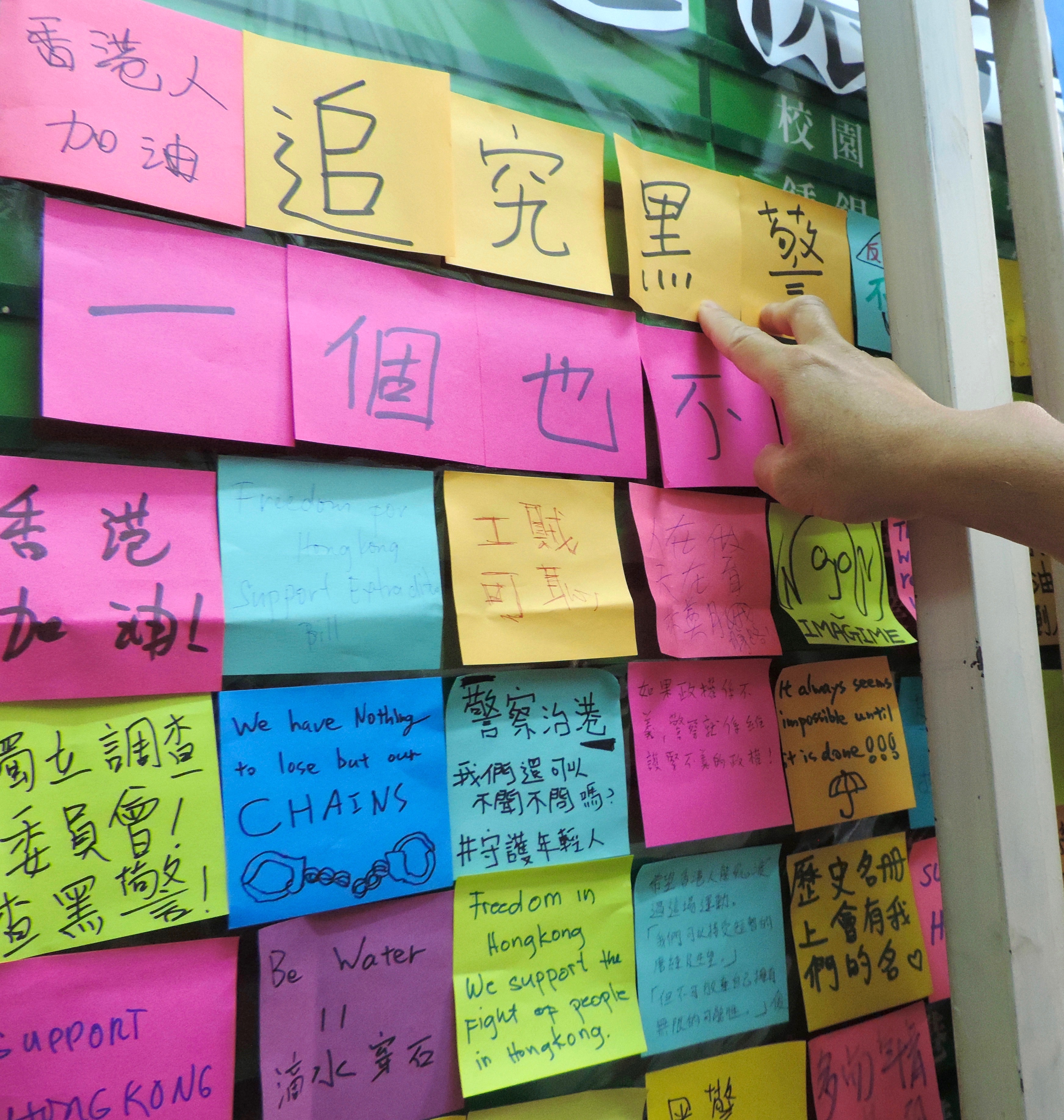 Utanför facket HKCTU:s kontor har demonstranter satt upp lappar där de skriver vad de tycker om polisens insats.