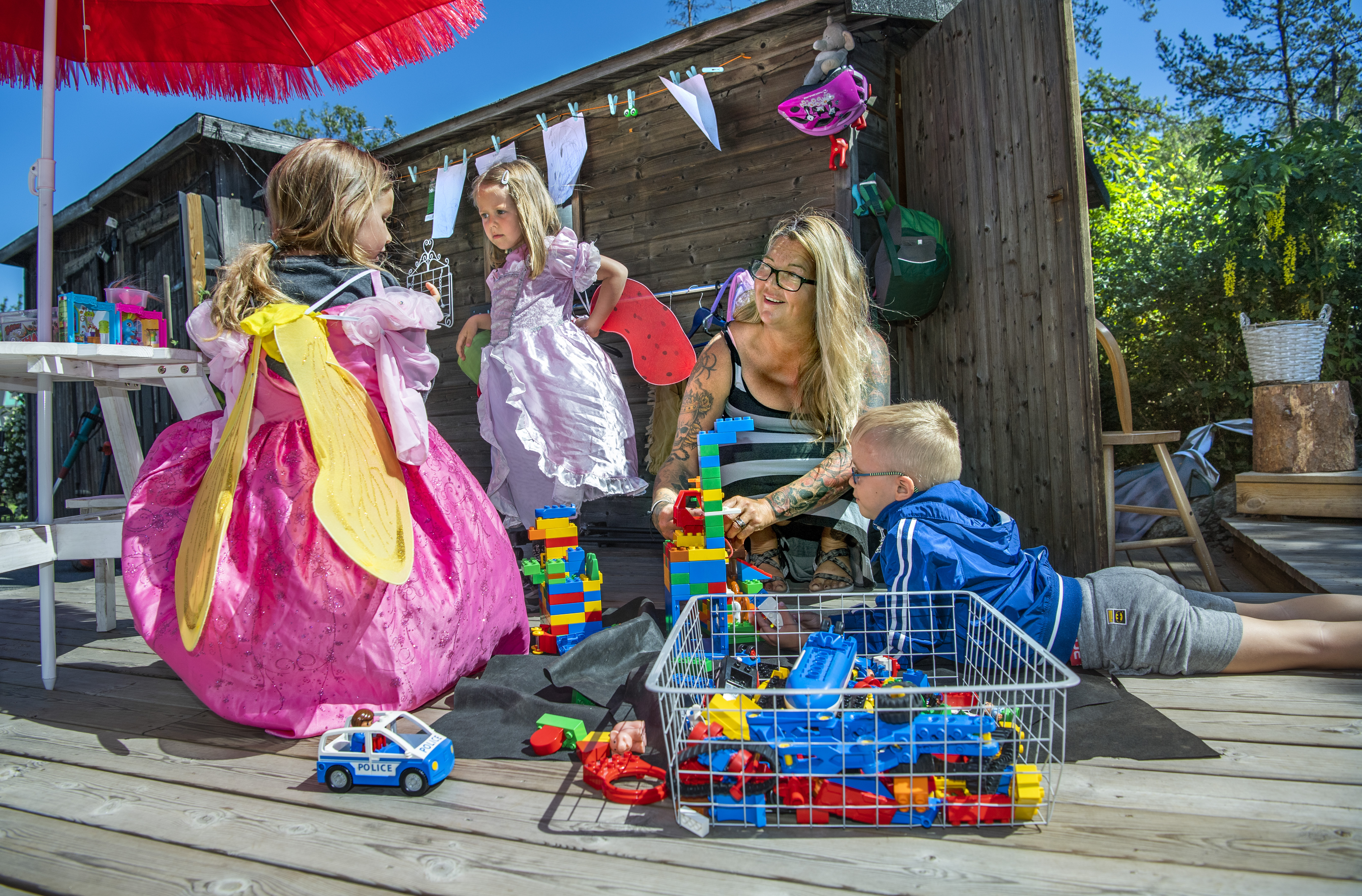 På husväggen hänger en basketkorg. Innanför ett plank skymtar ett stort trädäck med små möbler och kläder på en stång, där vajar blyertsteckningar i klädnypor på en lina vid sidan av ett fladdrande rosa Hawaii-parasoll.