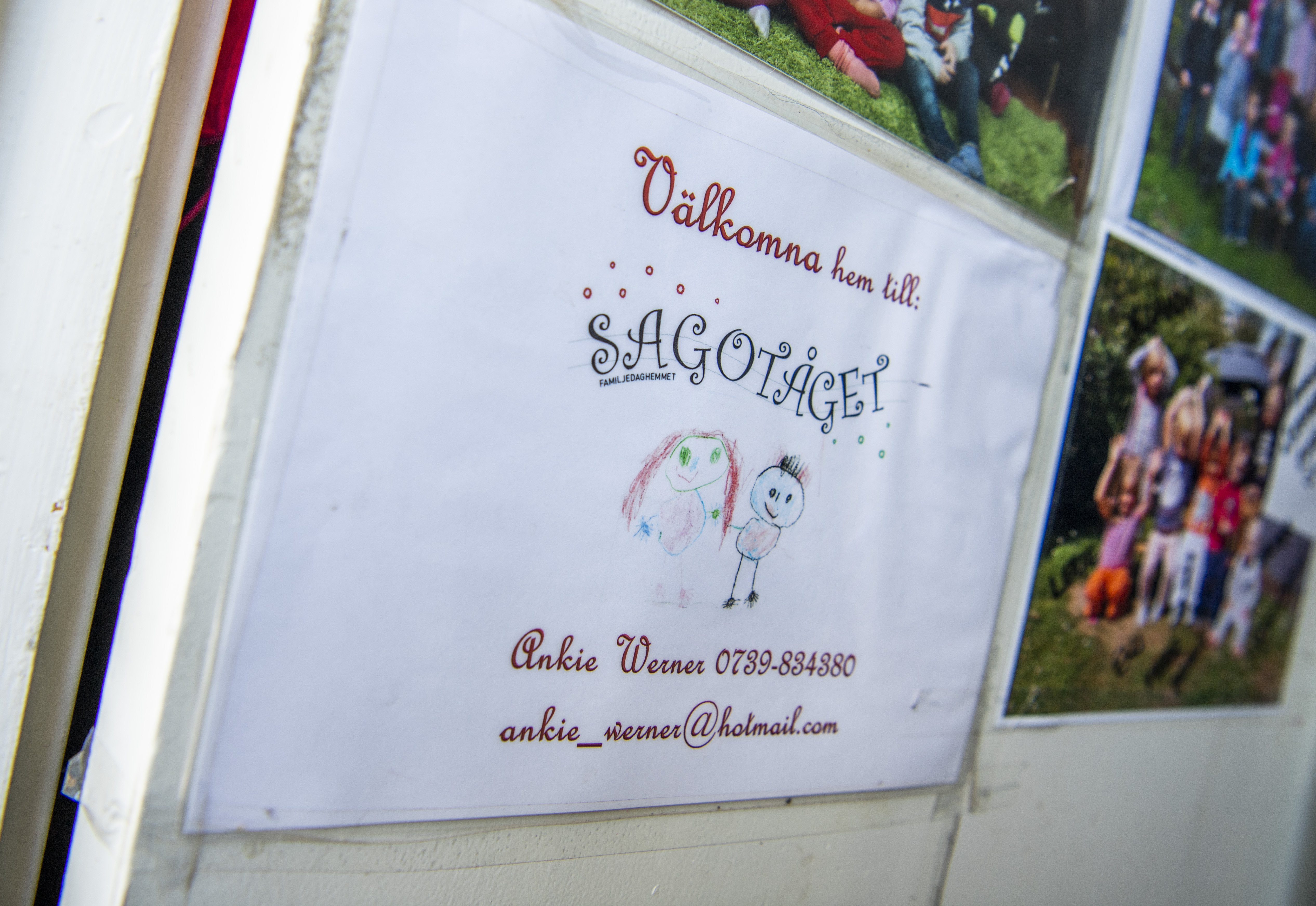 På insidan av radhusets öppna entrédörr bakom dem hänger fotografier av barnen och anslag för sjukdom.