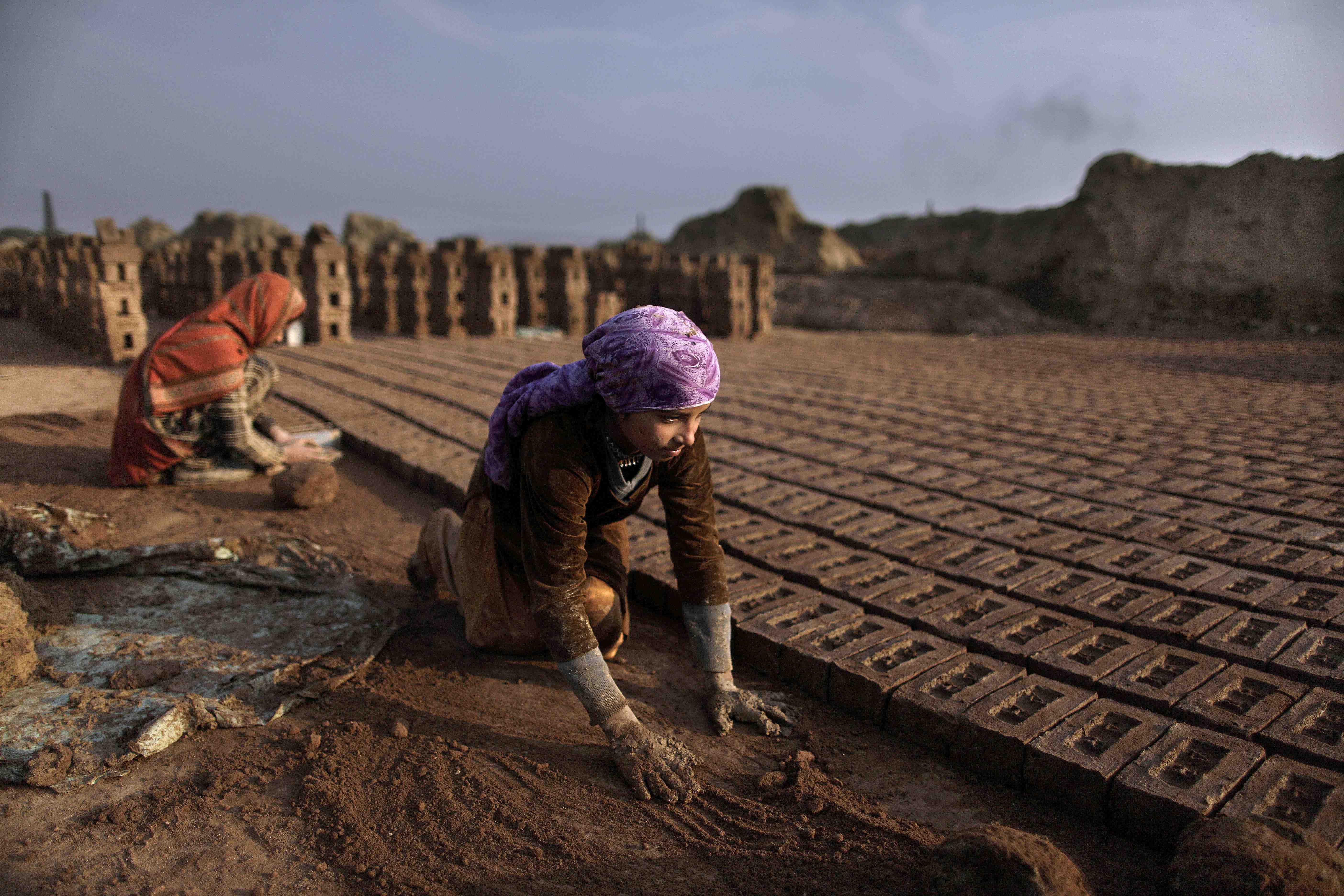 Barnarbete i Pakistan. Pesmina Zainullah, 9, och hennes syster arbetar på en tegelstensfabrik. Arkivbild från 2010.