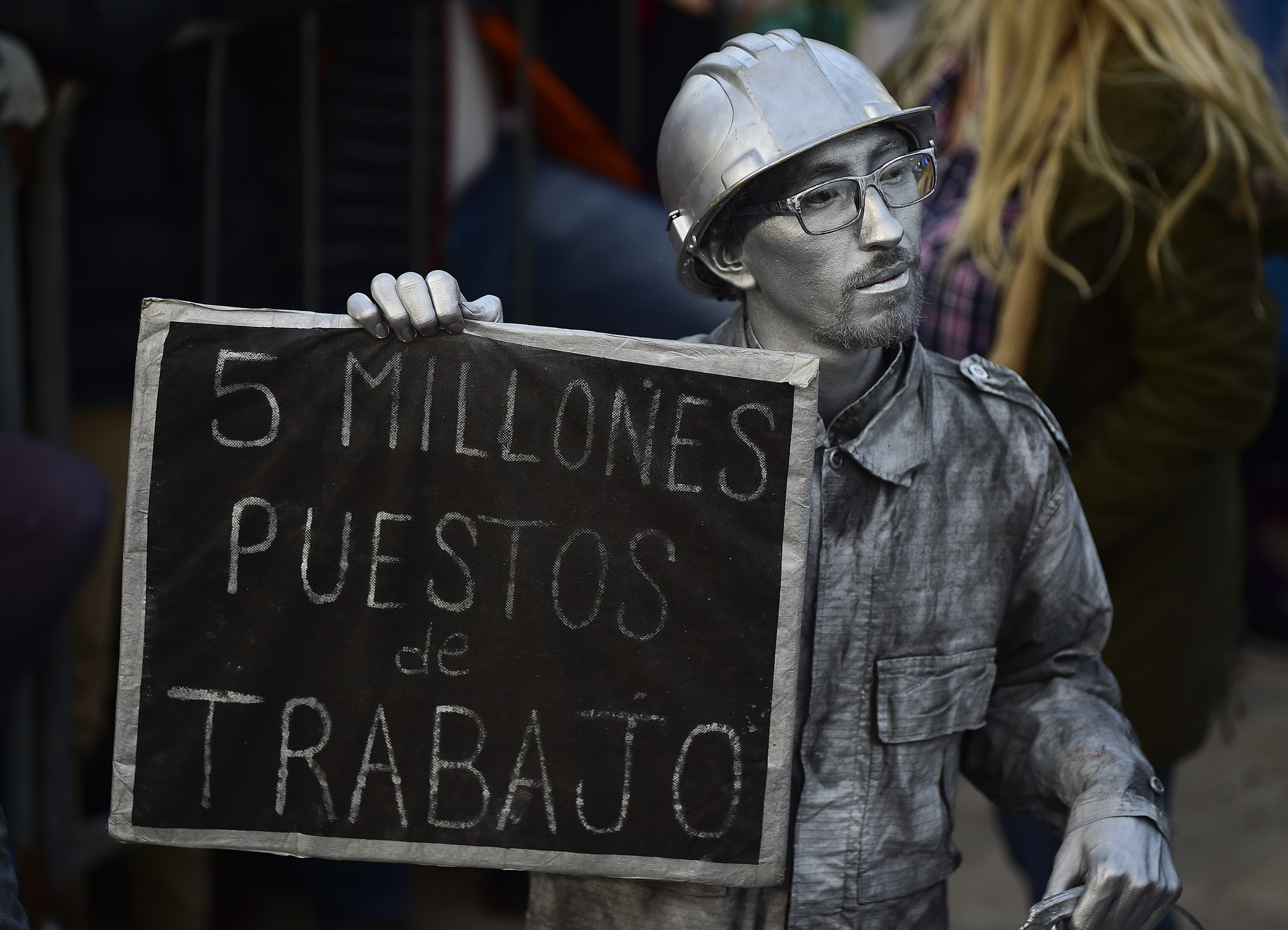 En man håller upp en skylt där det står ”Fem miljoner jobb” som refererar till hur många informella jobb det finns i Argentina. Bild från maj 2019.