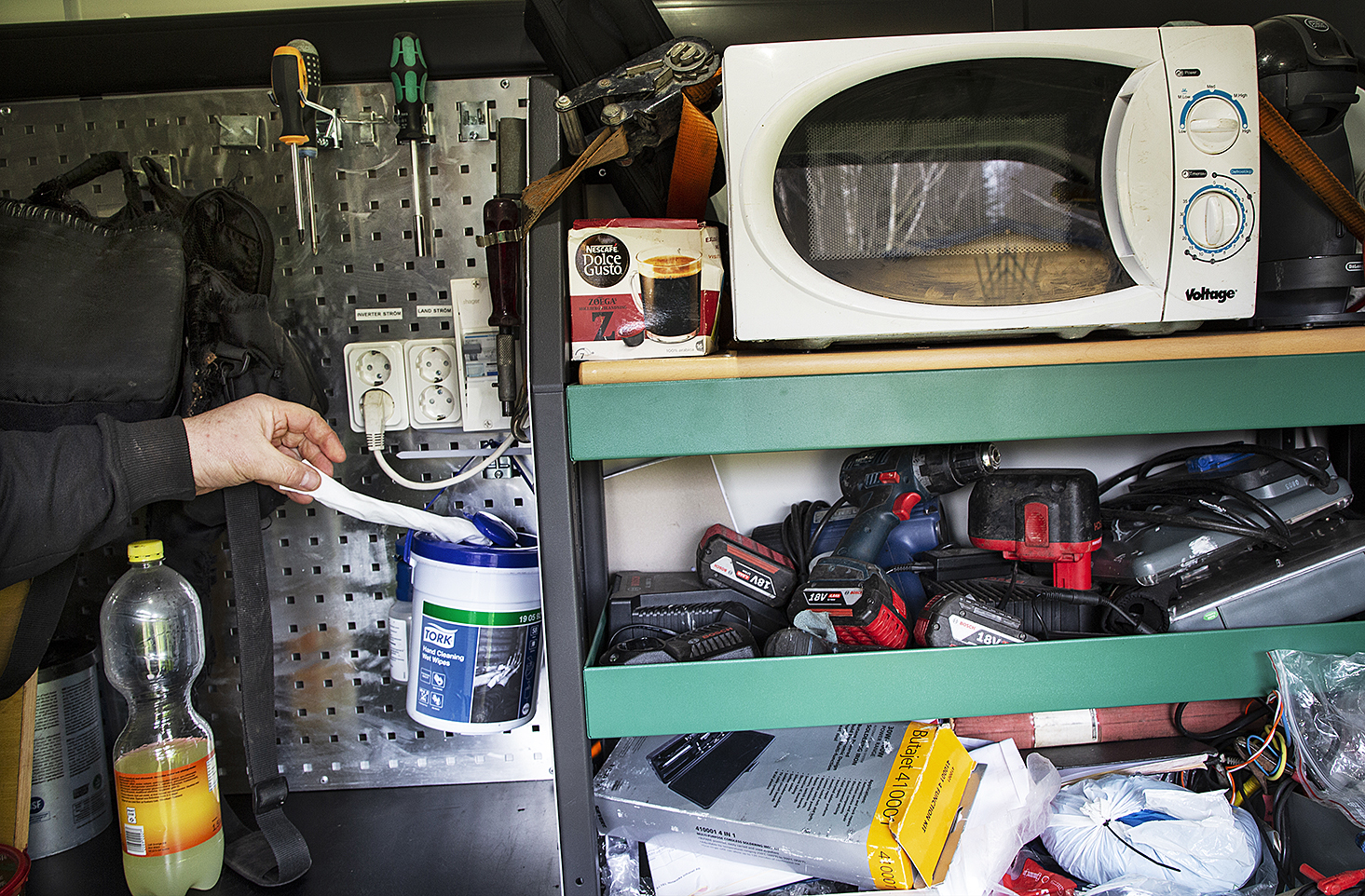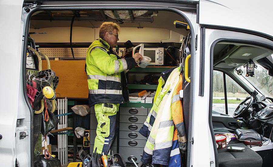 Kenneth kan värma mat i en mikrovågsugn i skåpbilens lastutrymme. Med hjälp av en inverter får han den växelström på 220 volt som krävs för att få ugnen att fungera. Ett fåtal tekniker har den möjligheten i företagets skåpbilar.