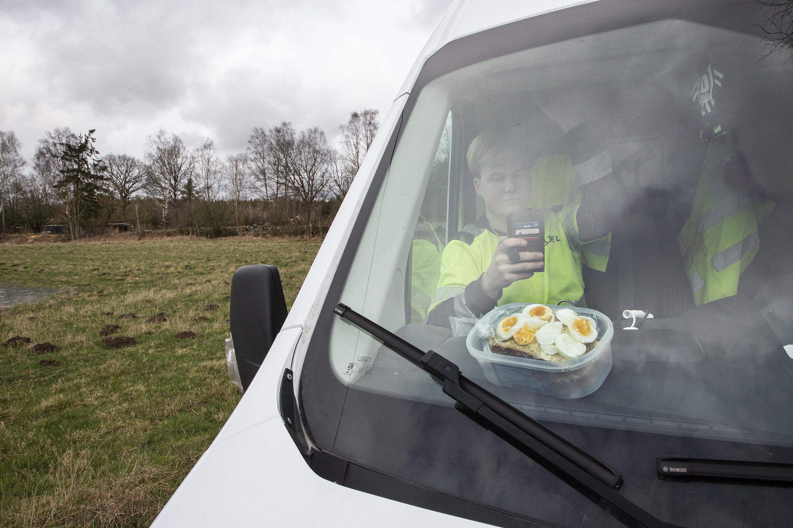 Koppar-och fiberteknikern Kenneth Almqvist från Eltel Networks ska ta lunch i bilen tillsammans med kollegan Jonathan Almqvist. De är far och som, men alltid kollegor på jobbet. De packar ihop sina verktyg och styr mot Skäralid.