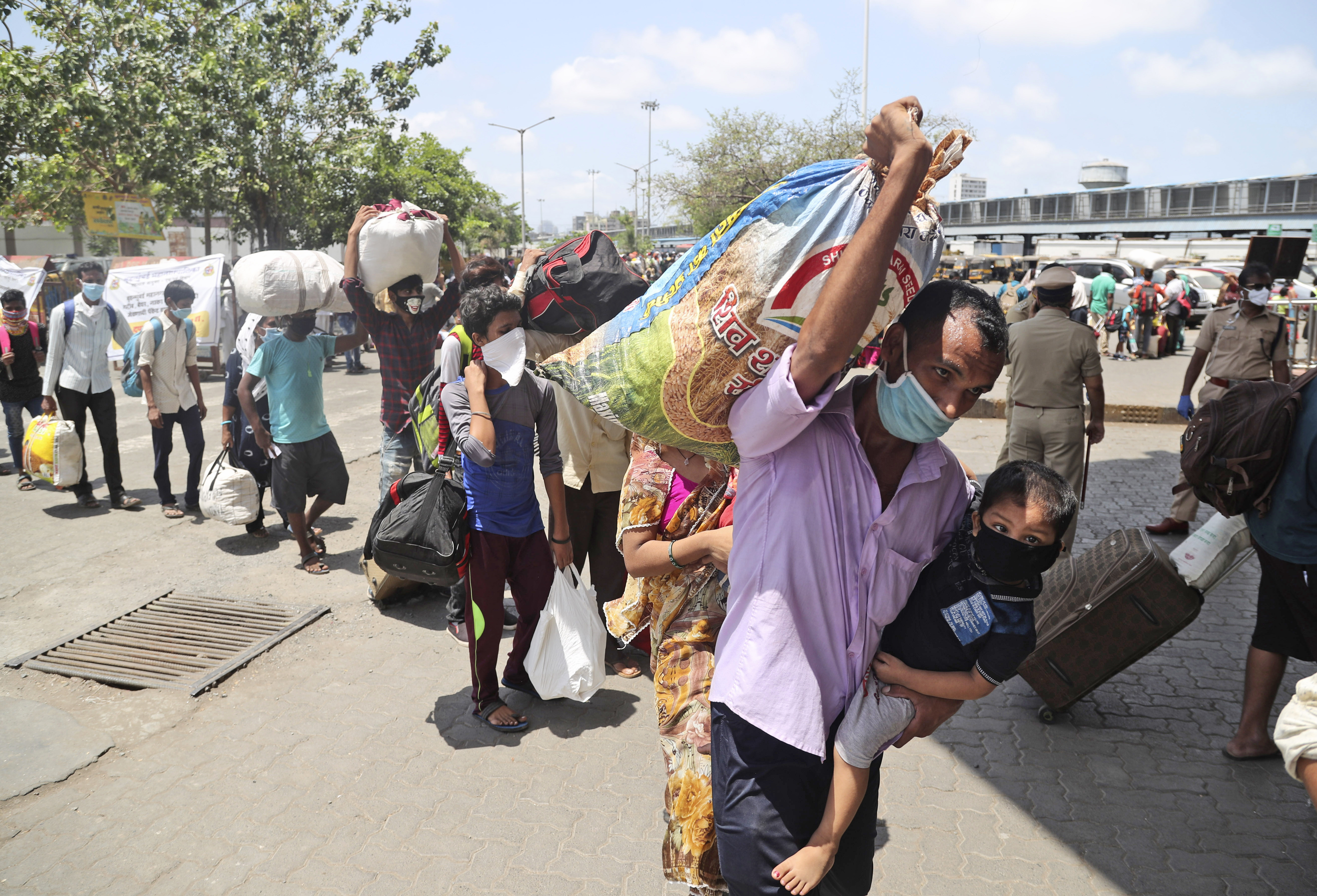 Indiska migrantarbetare på en järnvägsstation är på väg hem till Mumbai. Coronautbrottet har skakat om landets arbetsmarknad och nu planerar facken ännu en protest mot regeringen som gjort undantag från arbetsmarknadslagstiftningen.