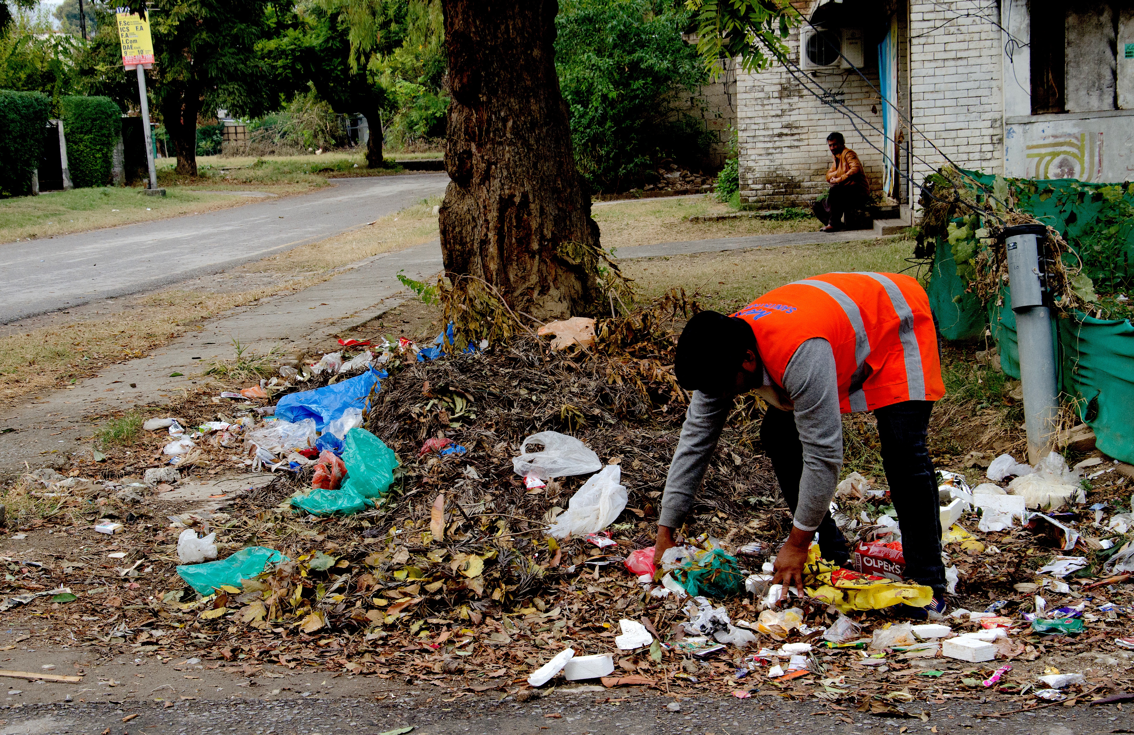 Ilyas Masih plockar skräp från gatan. Han är orolig att smittas av covid-19.