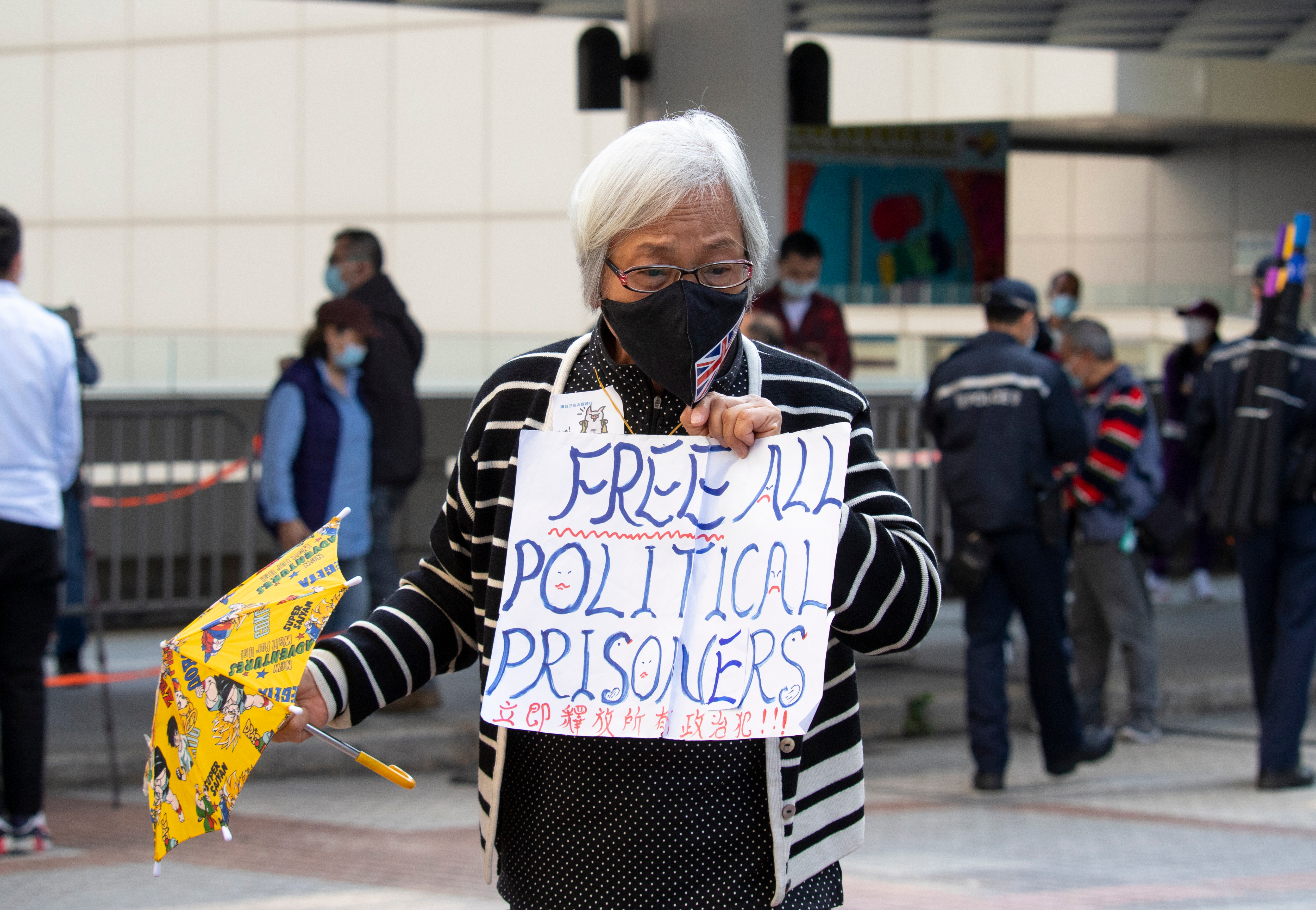 Kvinna demonstrerar för de politiska fångarna, varav många fackliga, i Hongkong i mars i år.