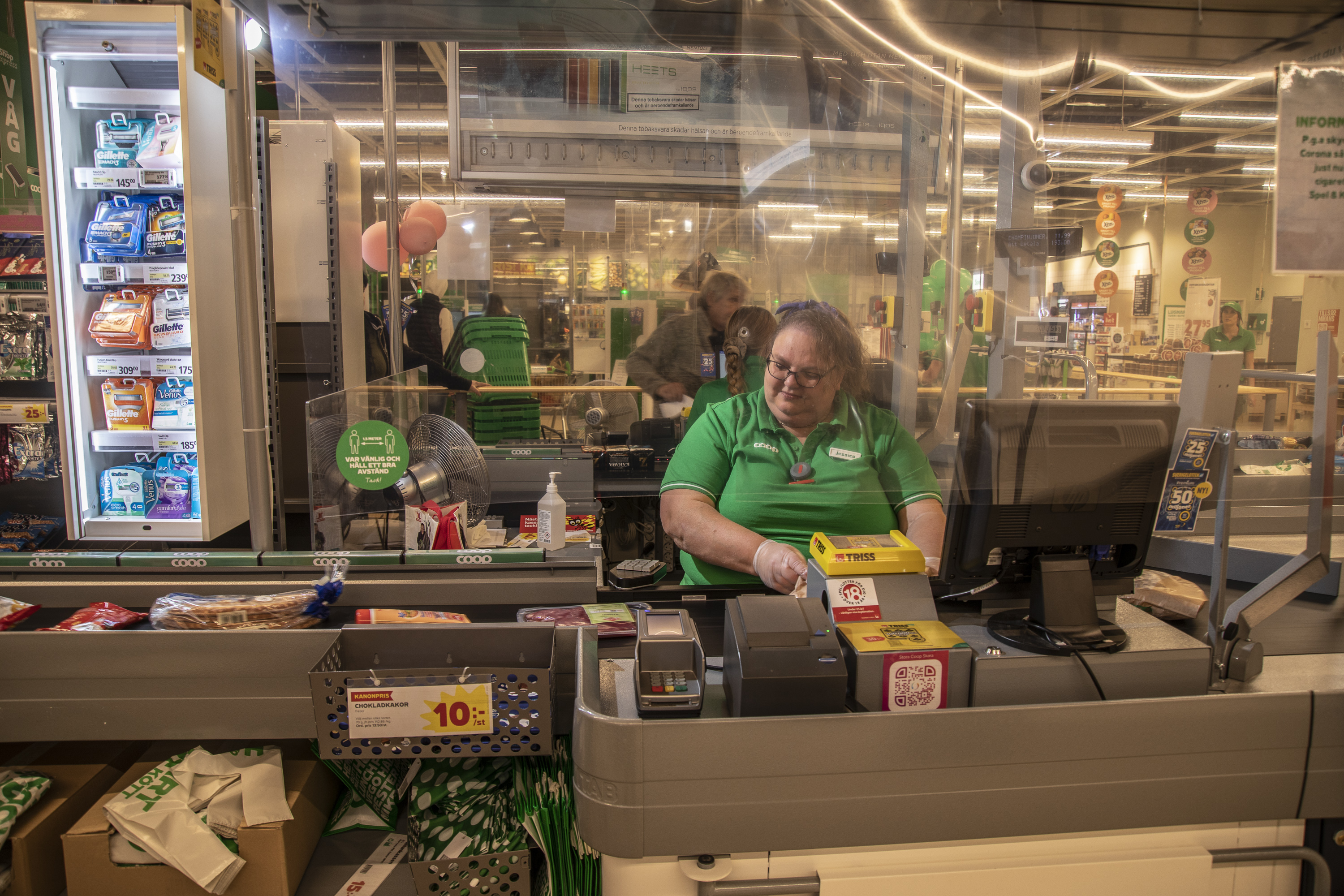 – Jag har fått rejält ont i ryggen, kan inte stå eller gå långa stunder. Därför är jag tillbaka sittande i kassan och också en del i självutcheckningen.
