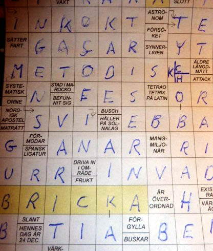 ”Vid korsordets nedre halva, (ungefär mitt i bilden) får jag fram ordet metodisk för rutan där det står ”Systematisk”. Så långt är allt frid och fröjd. Men i rutan där ”K” står tror jag också att den efterfrågade astronomens namn inte stavas med ”K”. Så vitt jag vet så stavas hans namn TYCHO BRAHE, vilket gör att rutorna inte räcker till eftersom det bara är nio rutor och TYCHO BRAHE tarvar tio rutor. Jag löste det på det sättet att jag gjorde ett lodrätt streck i rutan för ”K” och skrev ”K” i den vänstra halvan av rutan. Den högra halvan av rutan delade jag av med ett vågrätt streck så att den utgjorde två på varandra mindre rutor.