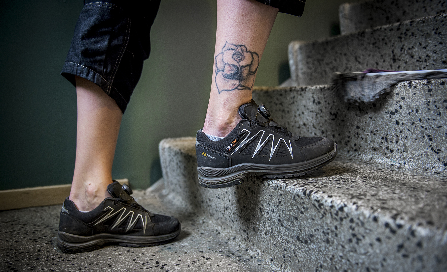 Använd rejäla skor och backa nerför trappan.
