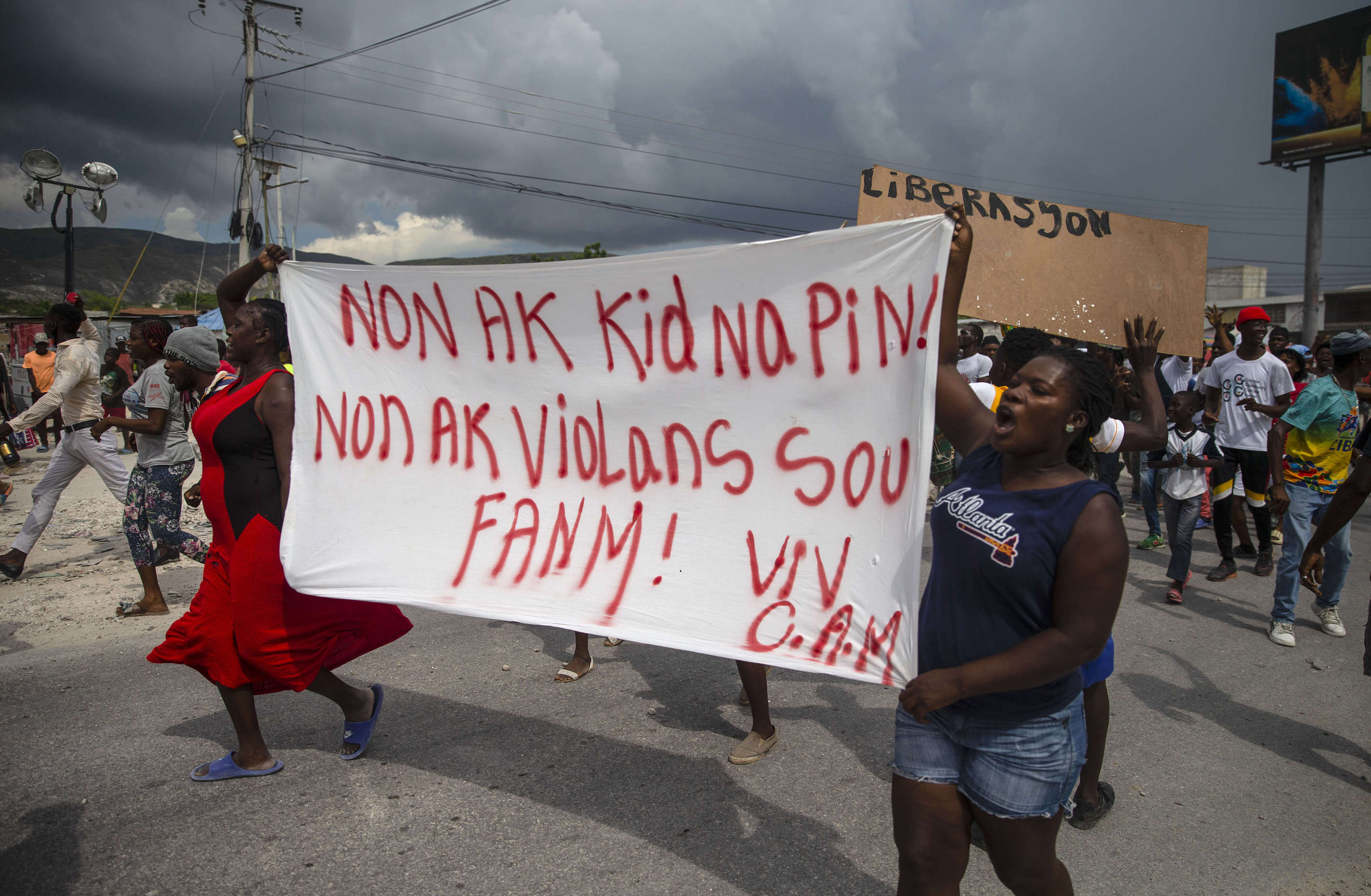 "Nej till kidnappningar! Nej till våld mot kvinnor!" Haitiska arbetare strejkar i protest mot säkerhetssituationen i landet.