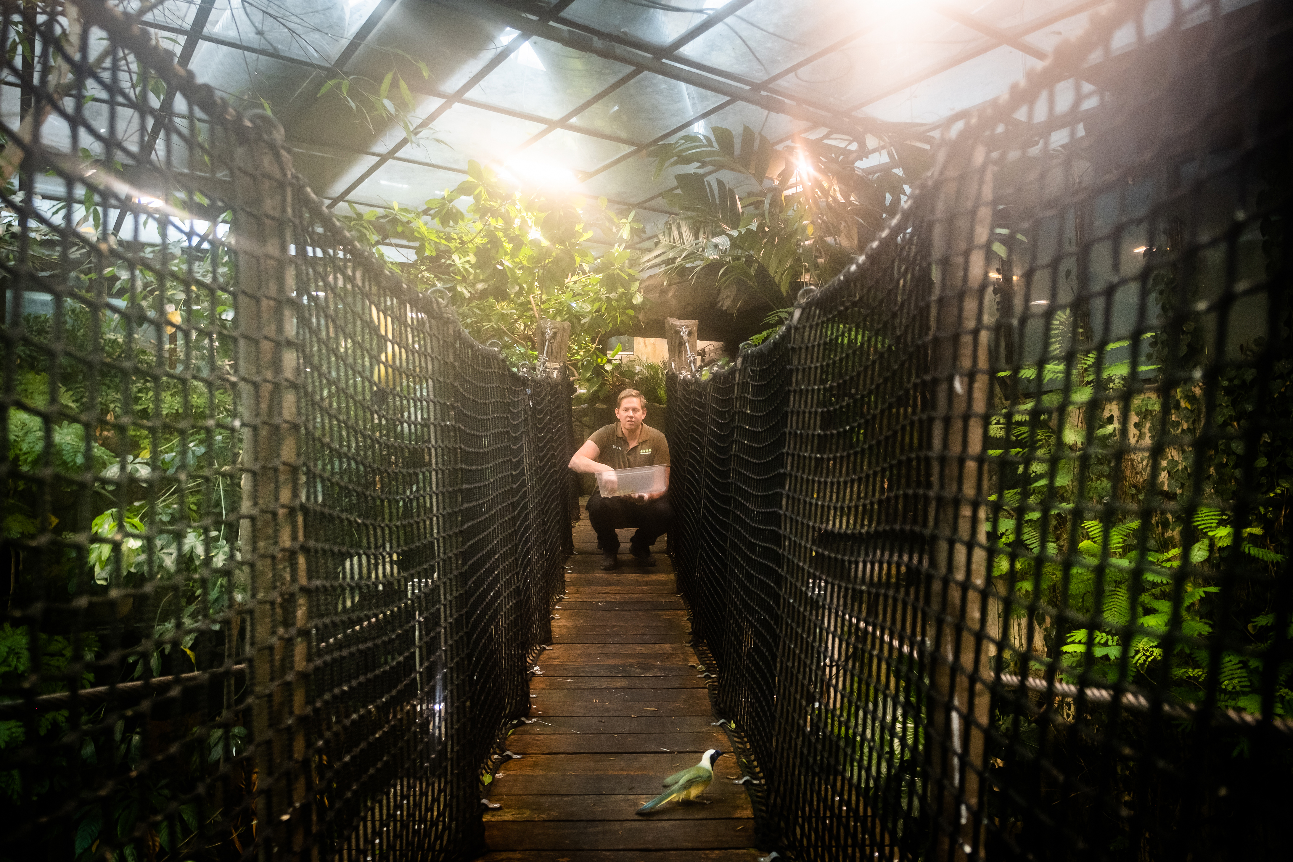 Zoologen Daniel Roth matar fåglarna högst upp i regnskogen. Universeums regnskog är en modell av en sydamerikansk tropisk regnskog. Här finns sengångare, apor och sällsynta fåglar samt växter som papaya, vanilj och monstera. Temperaturen är 20–25 grader under hela året, men det kan kännas varmare än så eftersom luftfuktigheten ofta är över 90 procent.